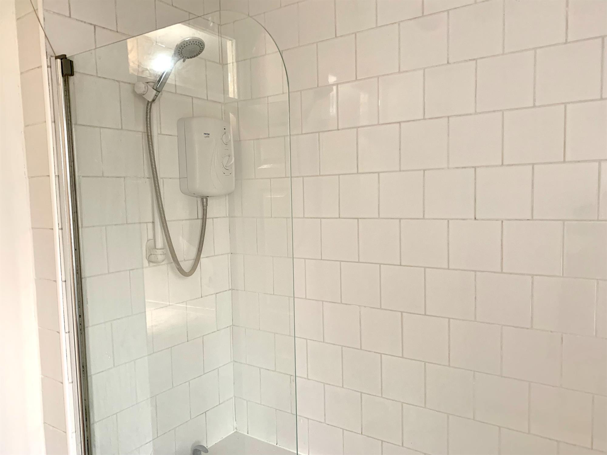 A white suite with an electric shower over the bath and a basin with a window to the front.
