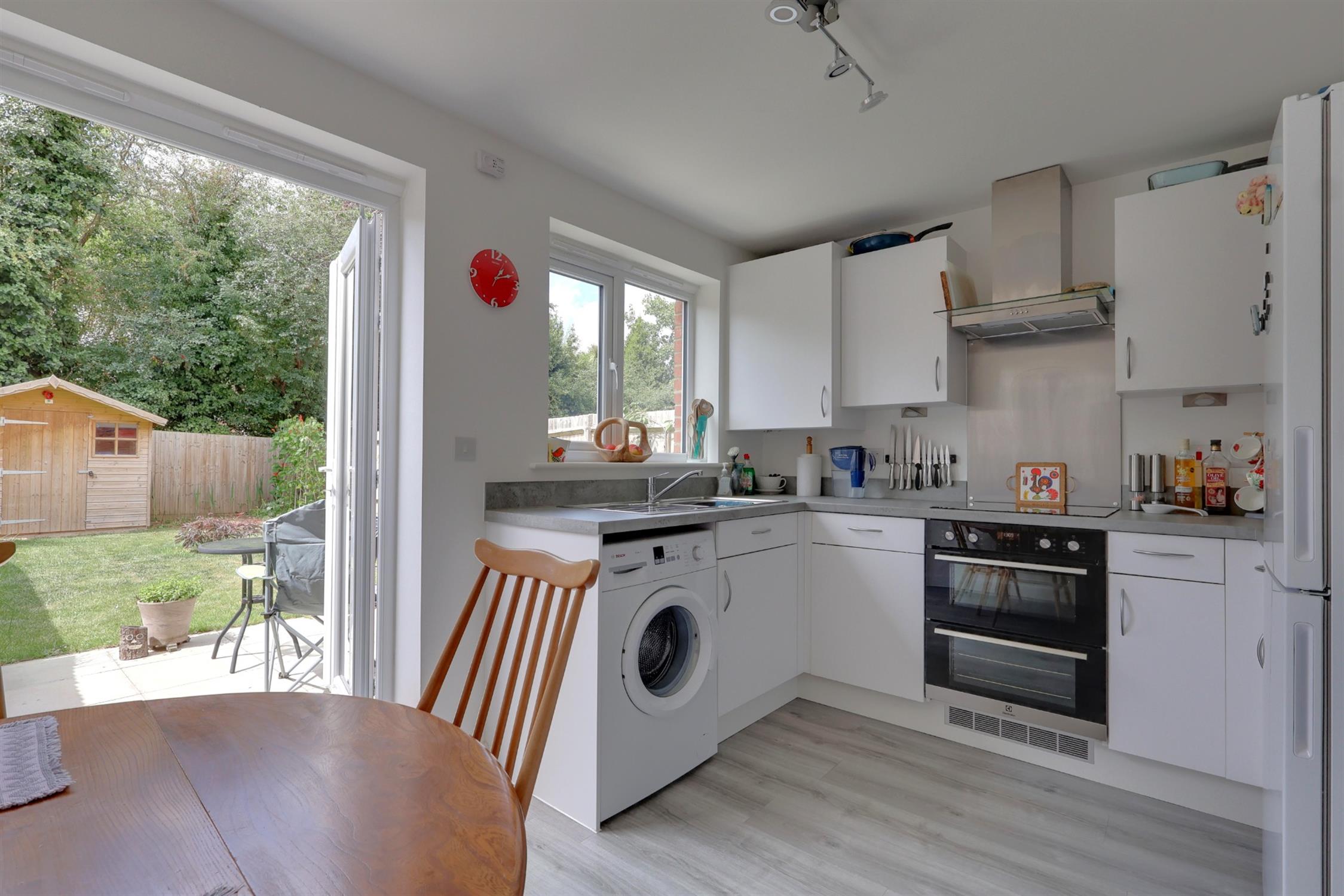 A range of wall and base cupboards with work surface over. Inset one and a half stainless steel sink unit with drainer. Integrated double oven and dishwasher. Plumbing for washing machine. Radiator. Double glazed window. French doors opening into the garden.