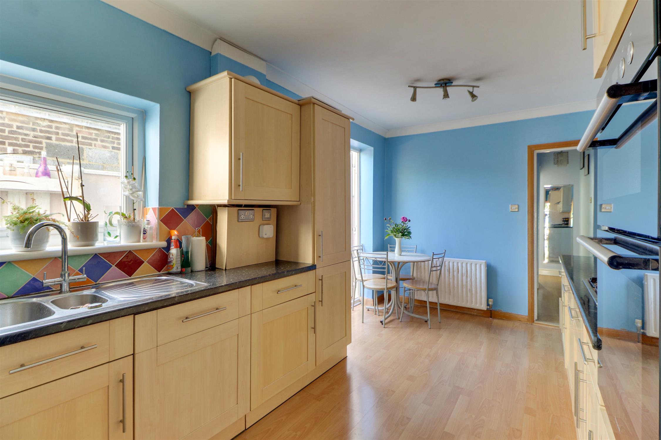 Smooth and coved ceiling, UPVC double-glazed doors and windows, radiator, a range of wall and base mounted units with roll-top work surfaces over, inset dual sink and drainer, space for fridge freezer, dishwasher, gas hob with extractor fan over, oven and grill and laminate flooring.