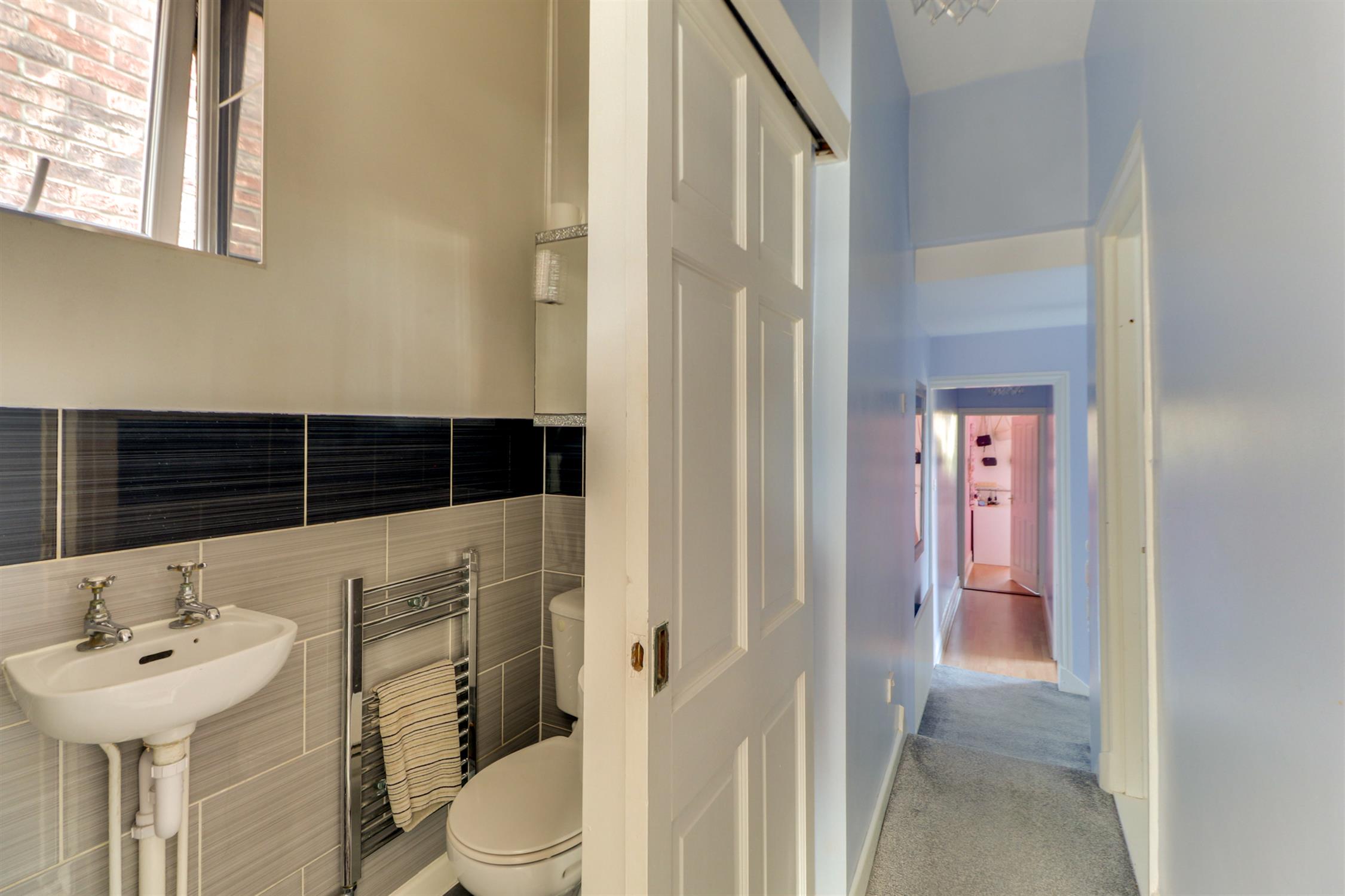 Textured ceiling, obscured UPVC double-glazed window, radiator and laminate flooring.