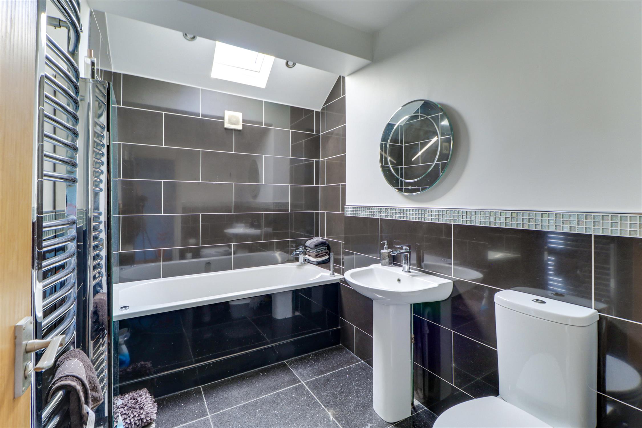 Smooth ceiling with inset spotlights, skylight window, jacuzzi bath, wash hand basin, tiled splash back, low level W.C, ladder towel radiator and tiled flooring.