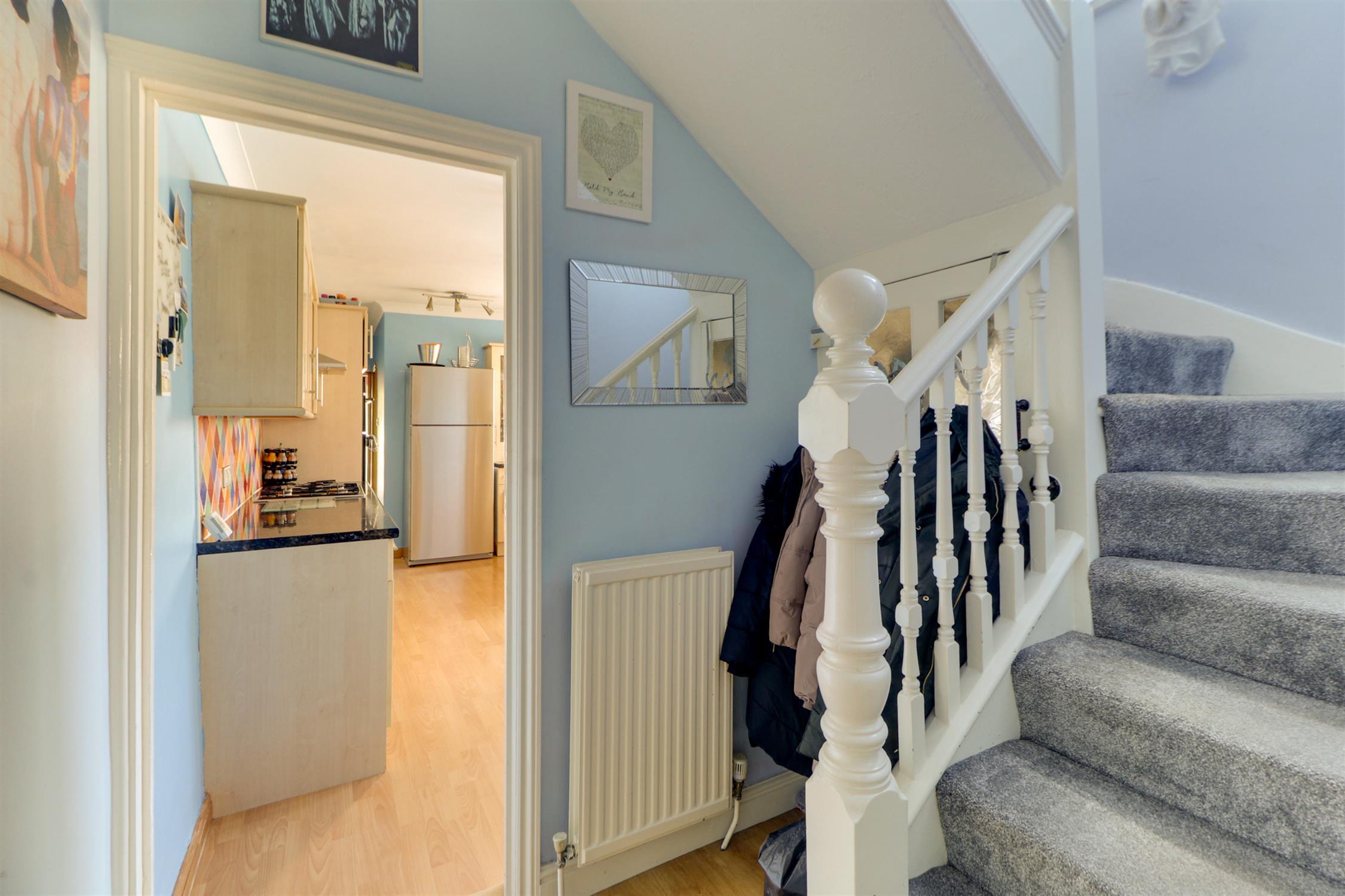 Textured ceiling, UPVC double-glazed window, stairs rising to first floor landing, radiator and laminate flooring.