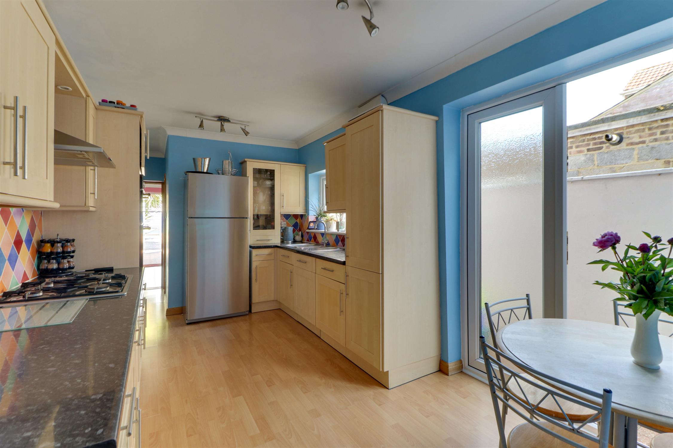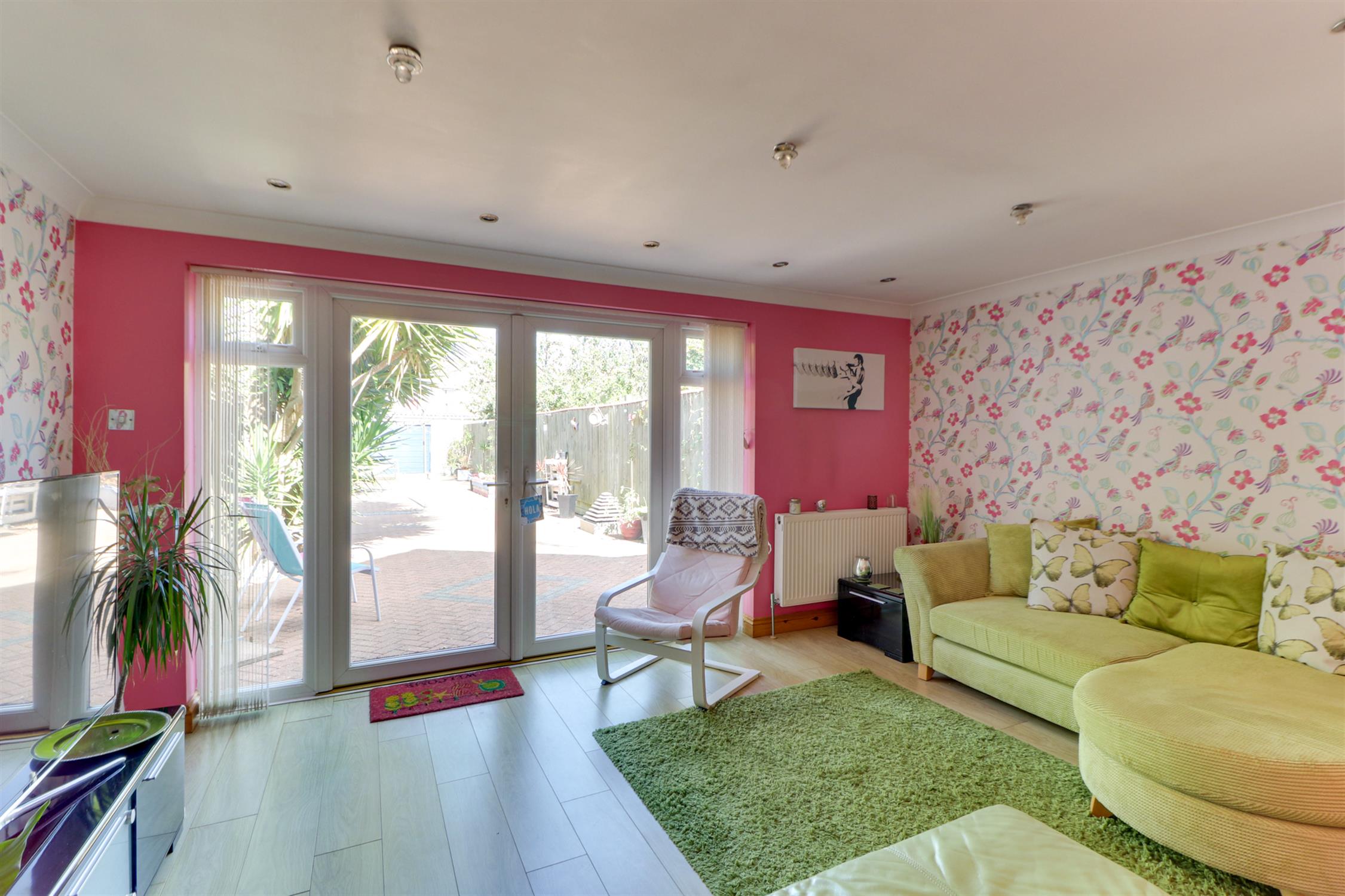 Smooth ceiling with inset spotlights, UPVC double-glazed windows and doors to garden, radiator and laminate flooring.