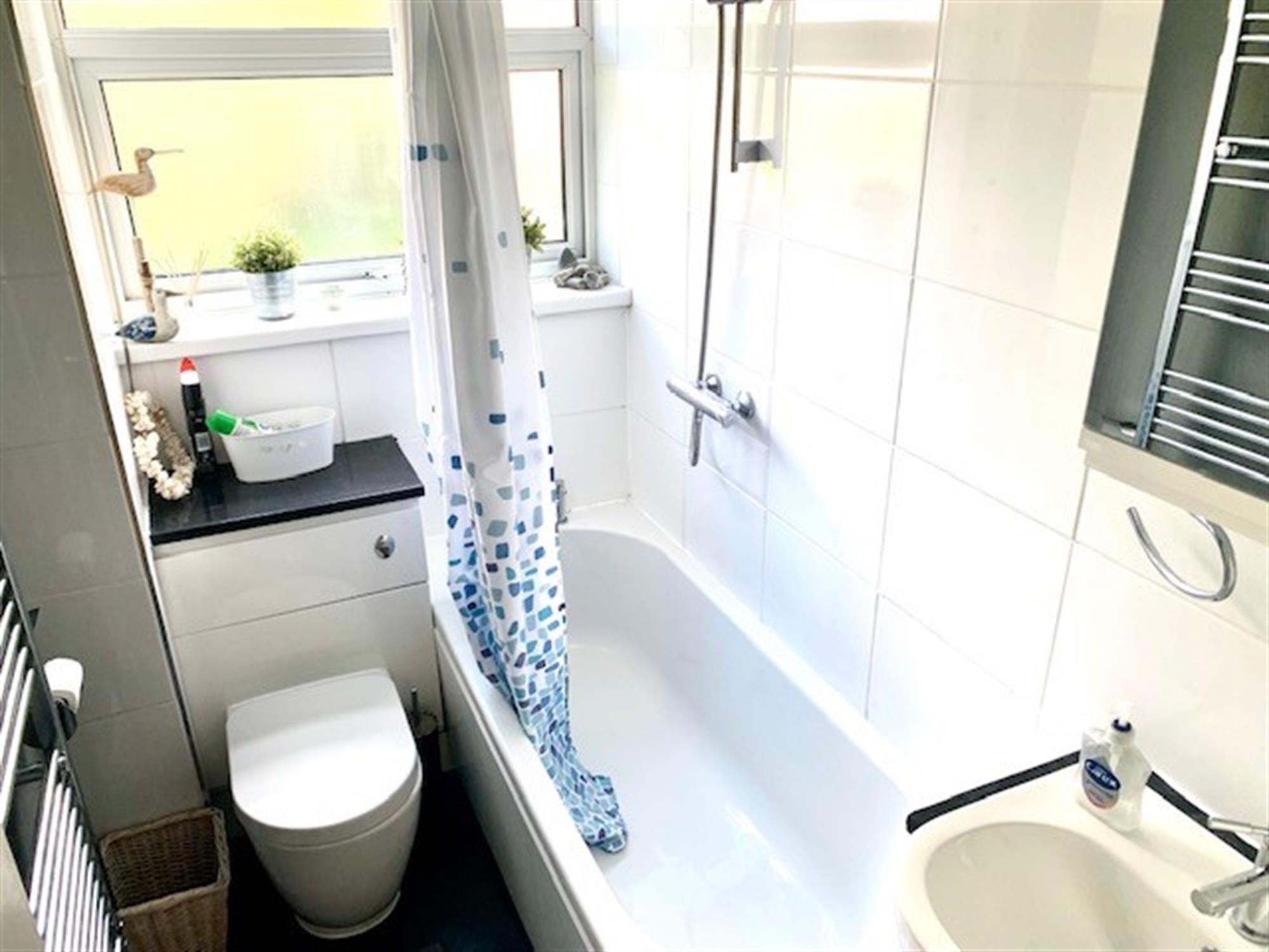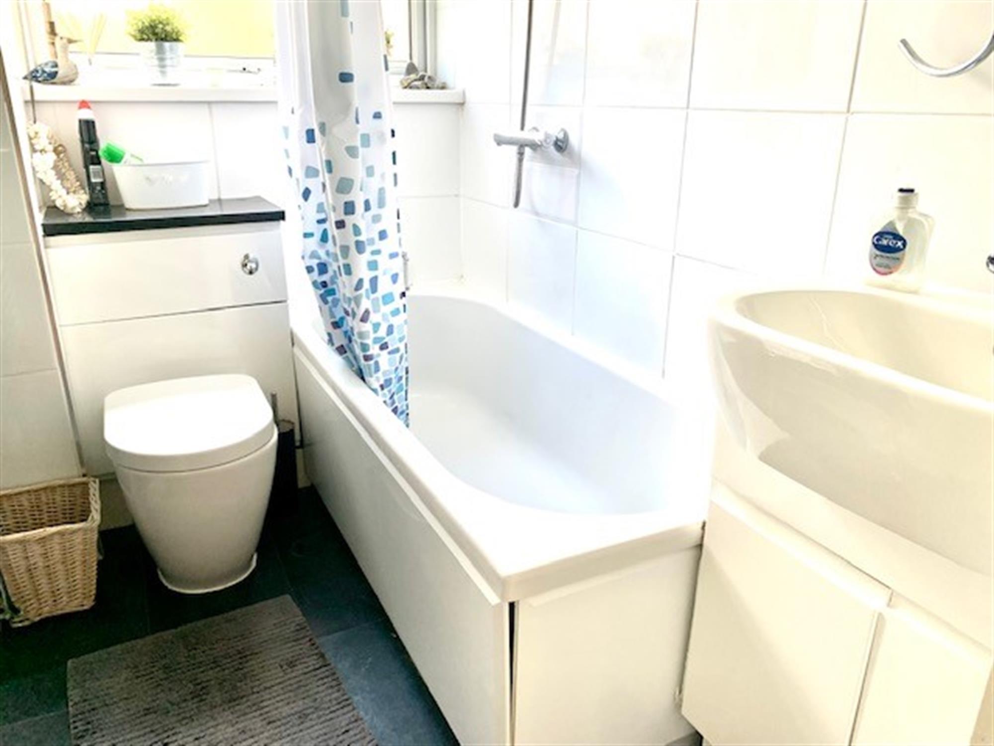 BATHROOM - White suite with low level w.c., sink with vanity cupboard and bath with shower over. Window to rear.