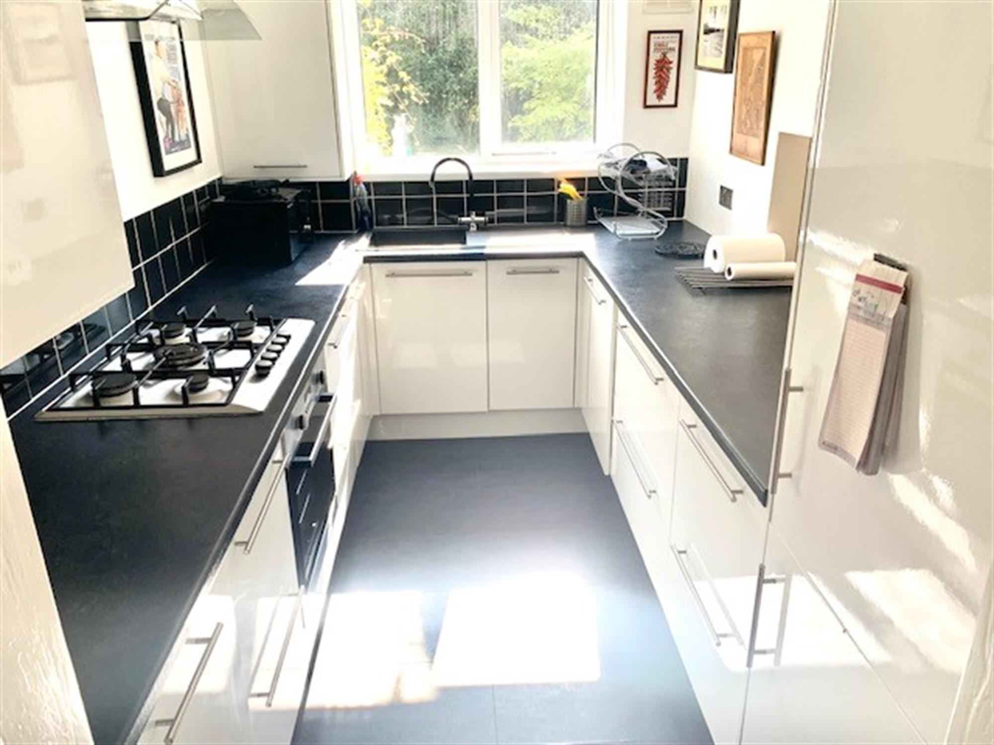 KITCHEN - Modern fitted white gloss kitchen with wall and base units. Window to front.