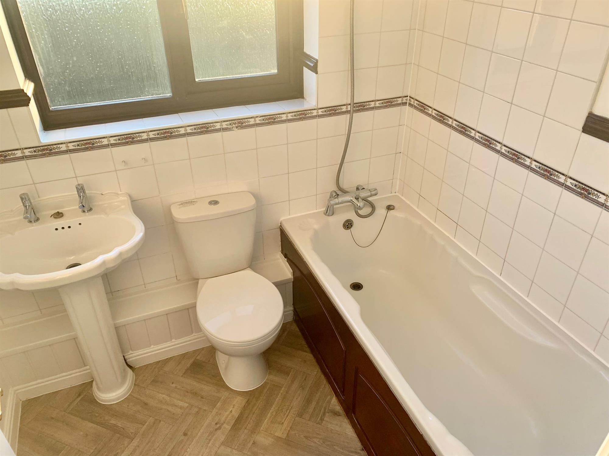 BATHROOM: White suite with toilet, sink, bath with shower over and window.