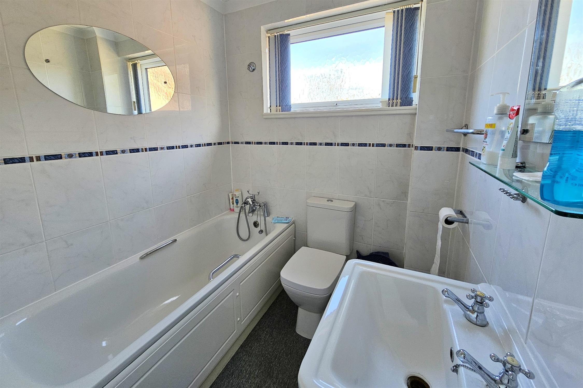 Obscure uPVC window to side aspect. Suite comprises panelled bath with central mixer tap with telephone style shower attachment, close coupled WC, pedestal wash basin. Radiator. Fully tiled walls and electric shaver point.