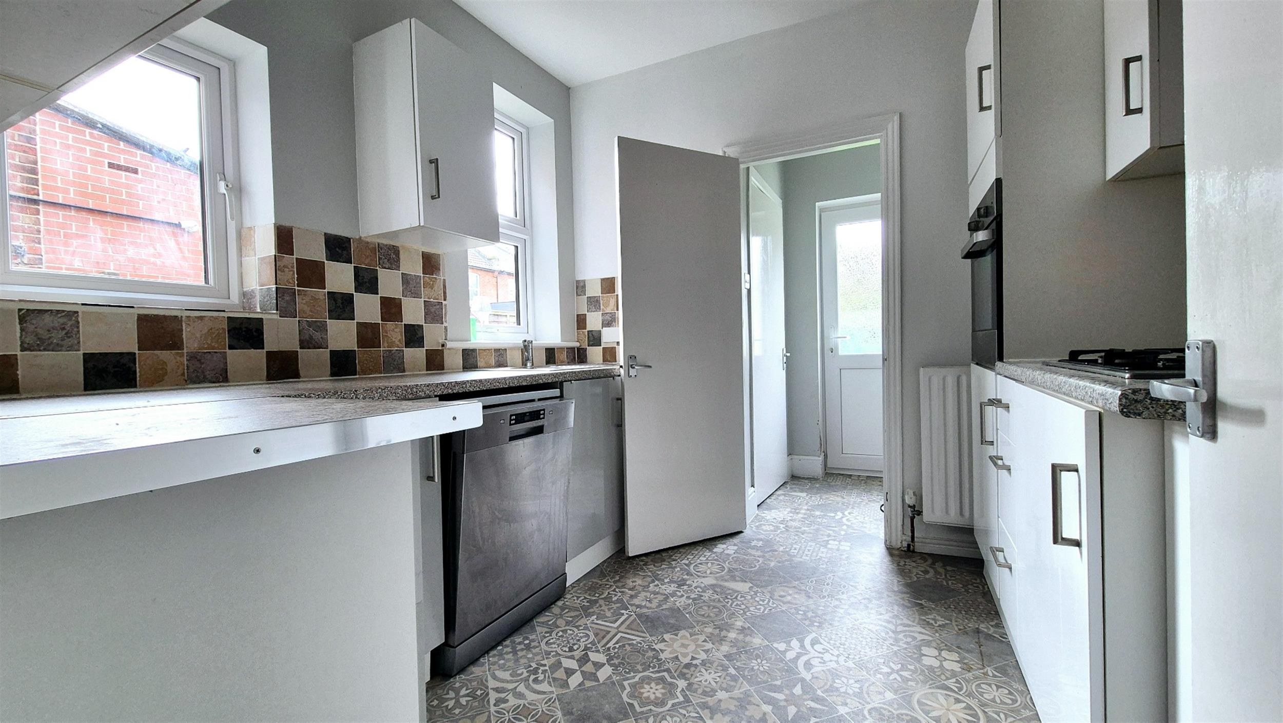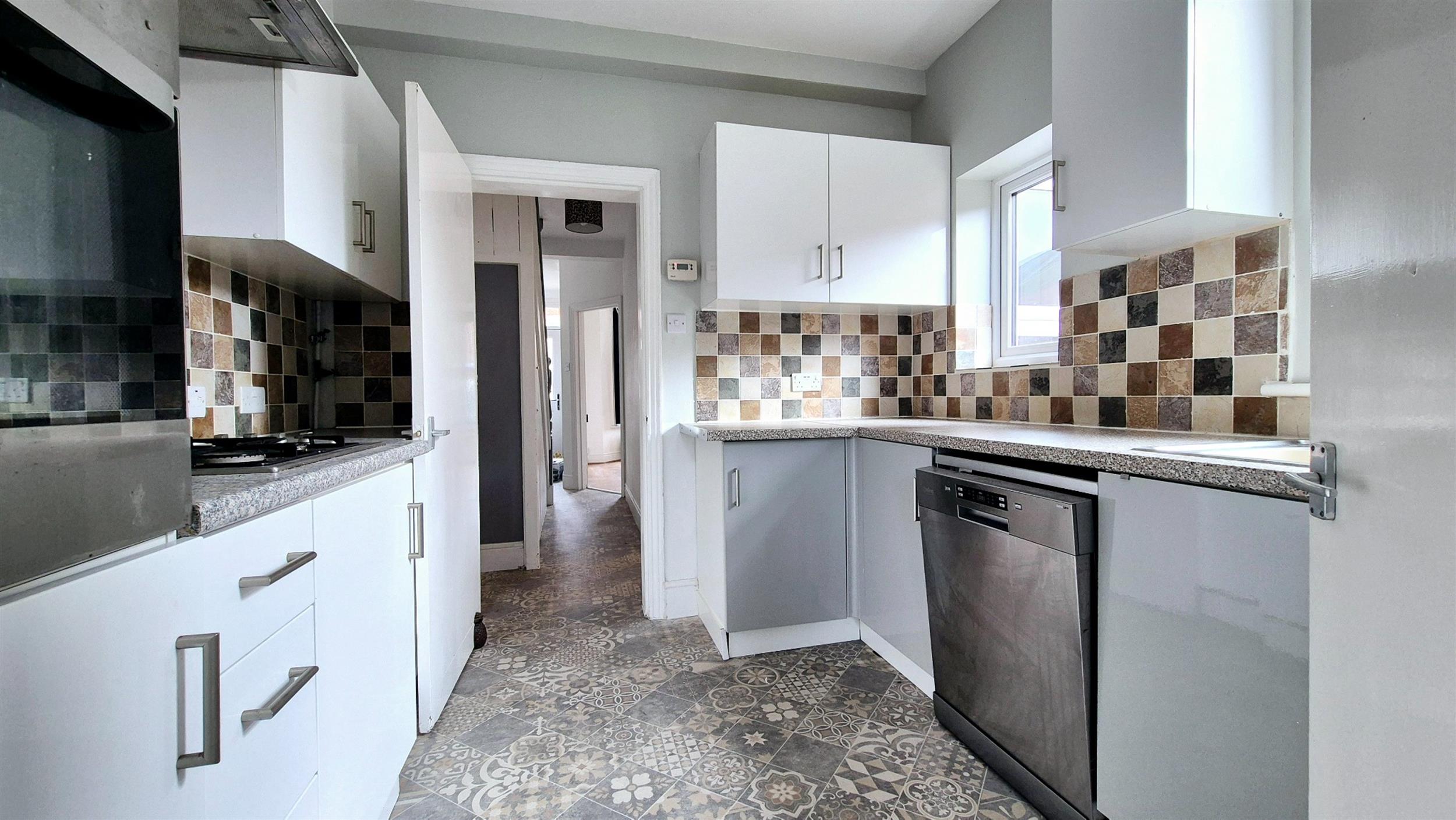 KITCHEN – Modern white & grey gloss kitchen with various wall and base units. Appliances consist of: gas hob & electric oven. Space for fridge/freezer (owner may supply upon request). Window to side. Door through to Utility area & cloakroom.