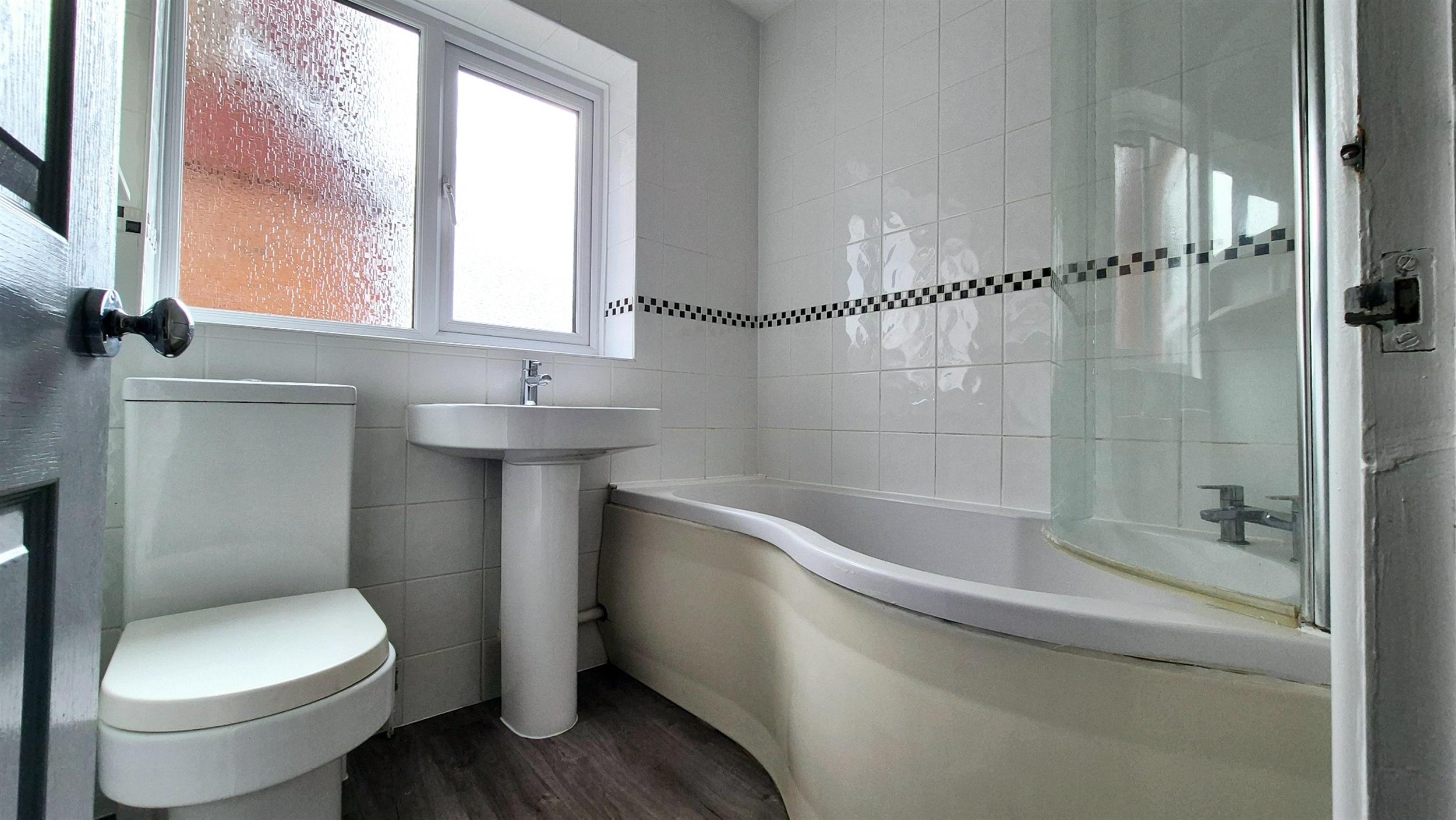 BATHROOM – White suite bathroom with electric shower over the bath, sink and toilet.