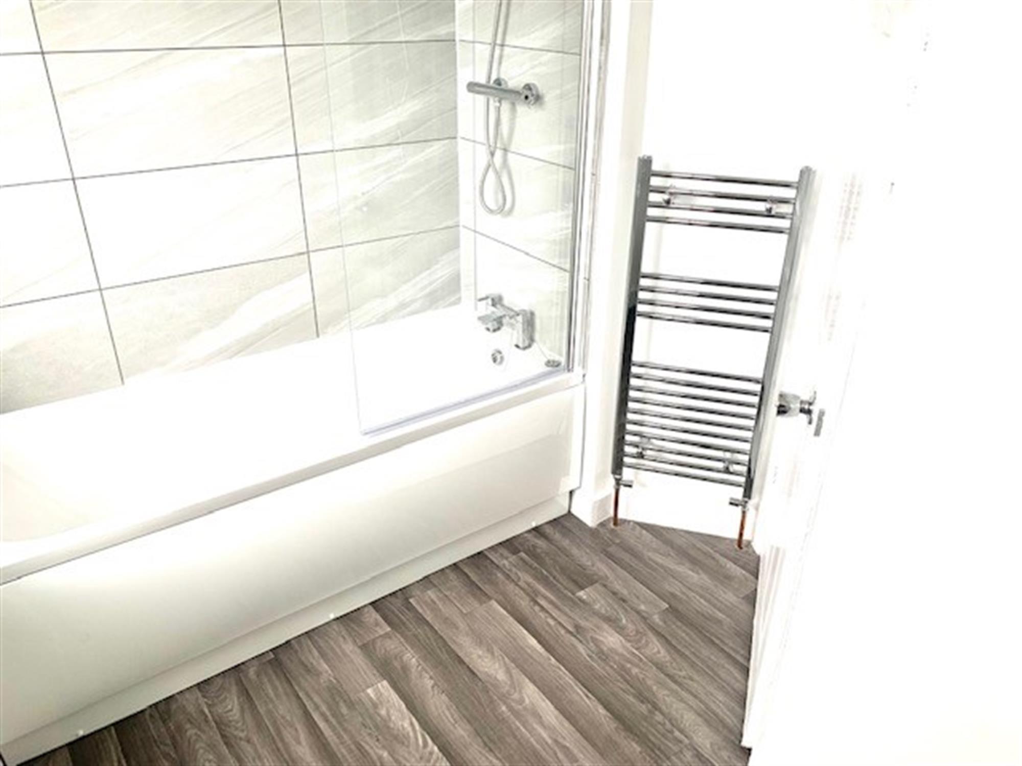 FAMILY BATHROOM - New Three piece white suite with tiled floor. Wash hand basin, w.c. and bath with thermostatic shower.