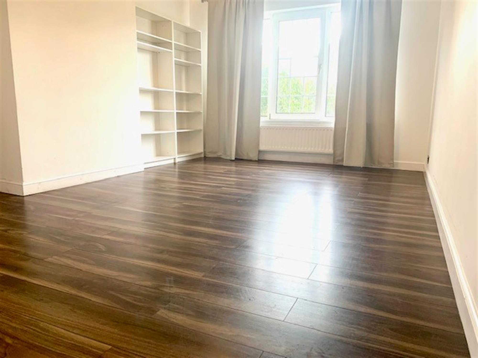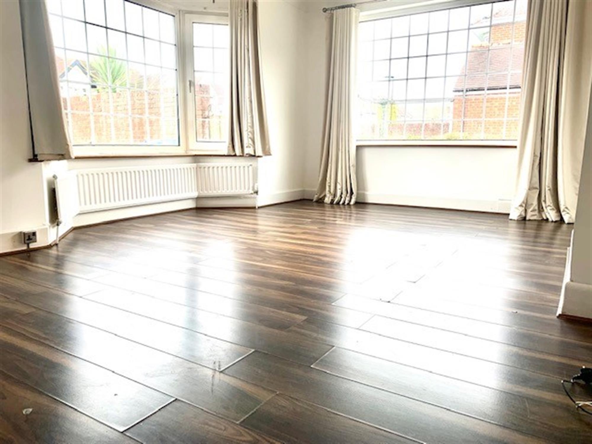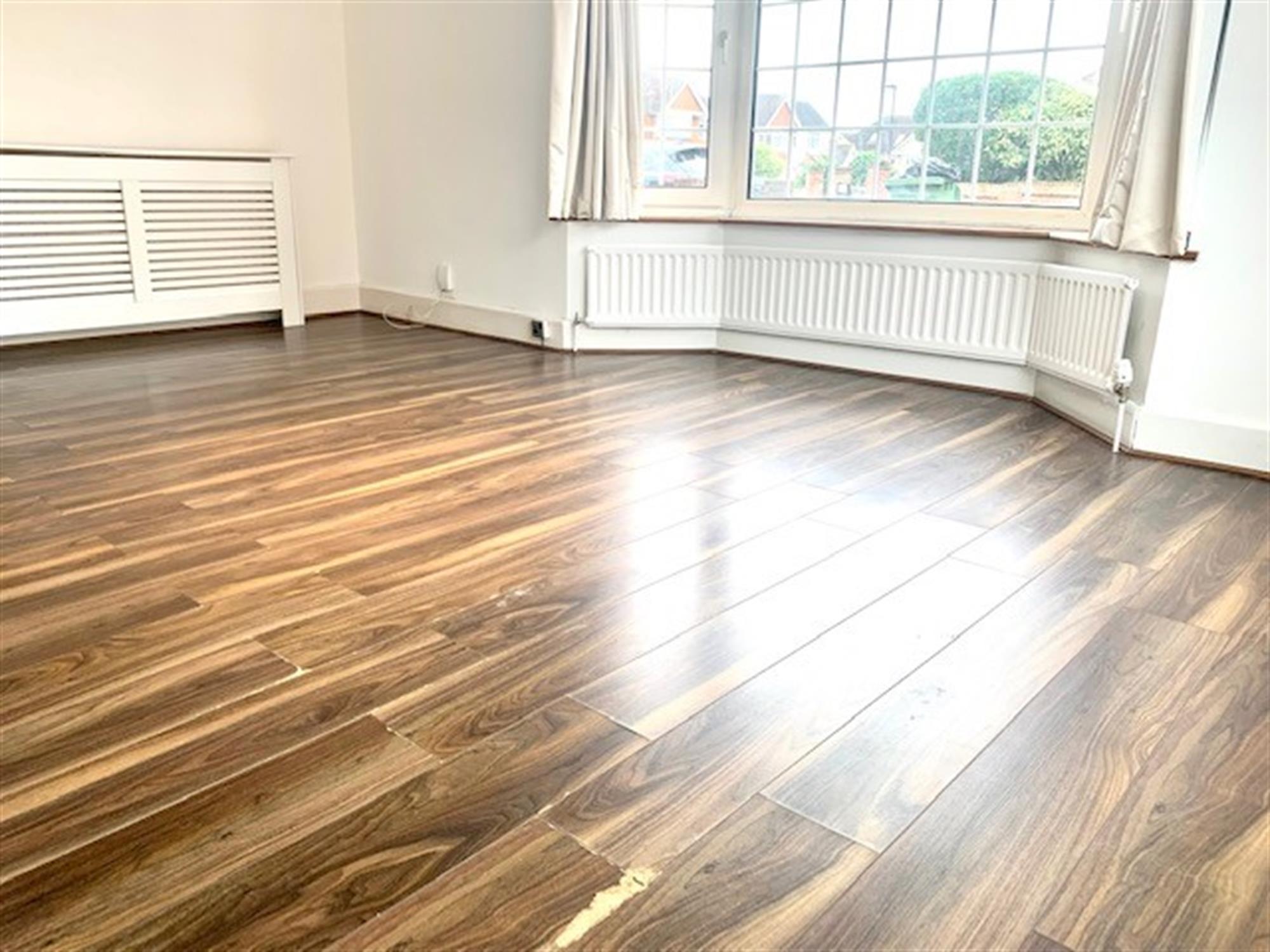 LOUNGE - Large window to front, laminate flooring and built in shelving unit.