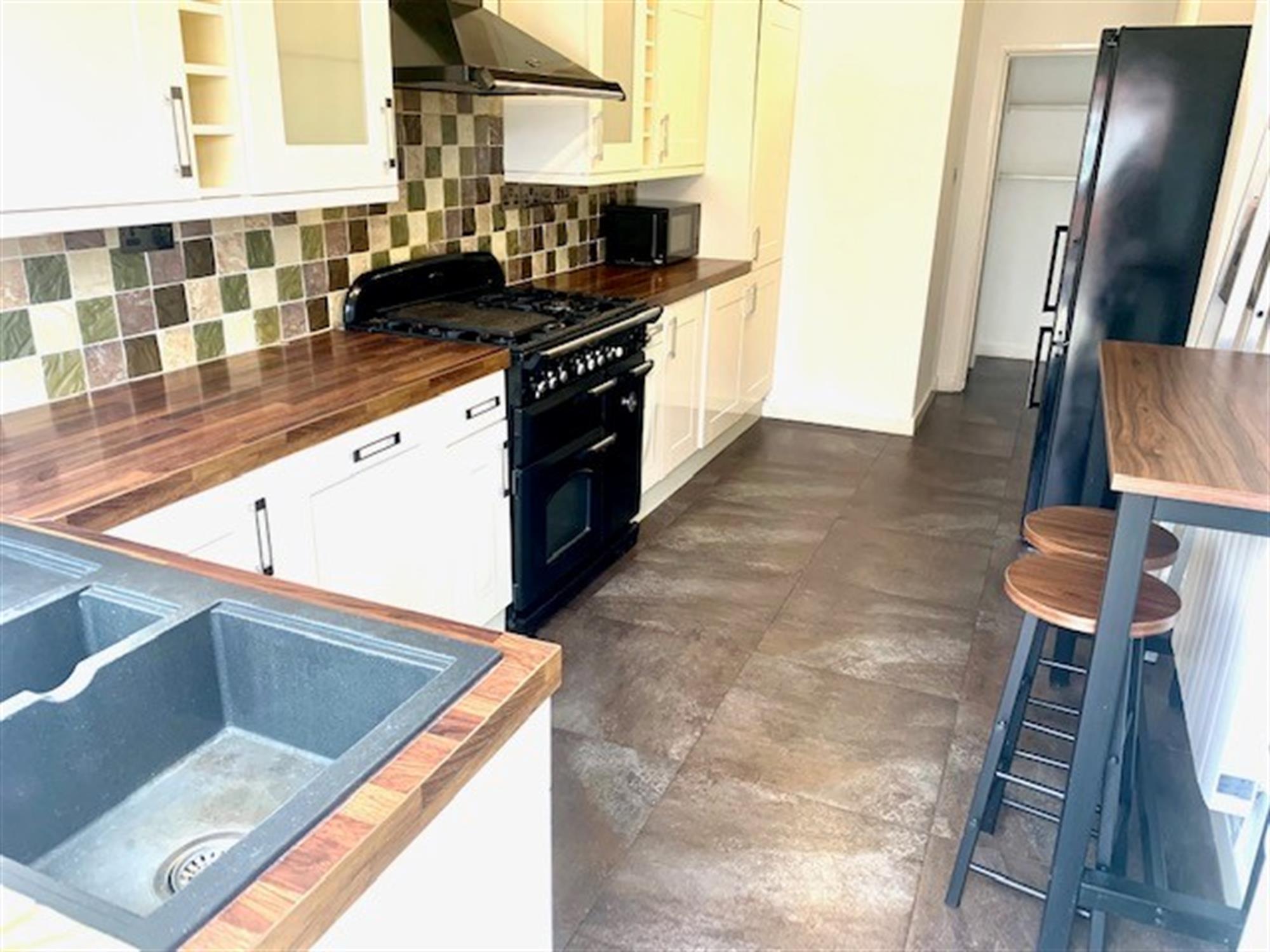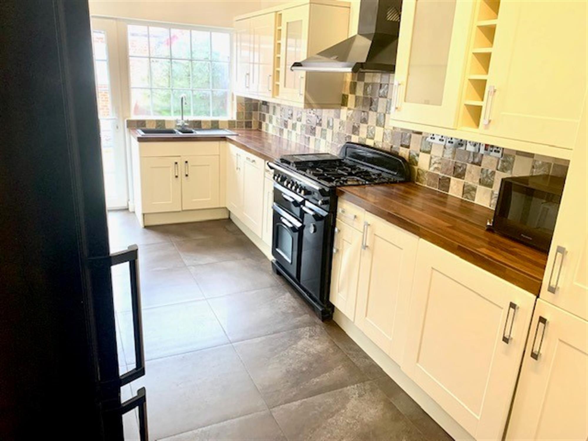 KITCHEN - A range of various wall and base units. Appliances consisting of Range cooker, fridge/freezer, integral dishwasher, integral washing machine and door to garden.