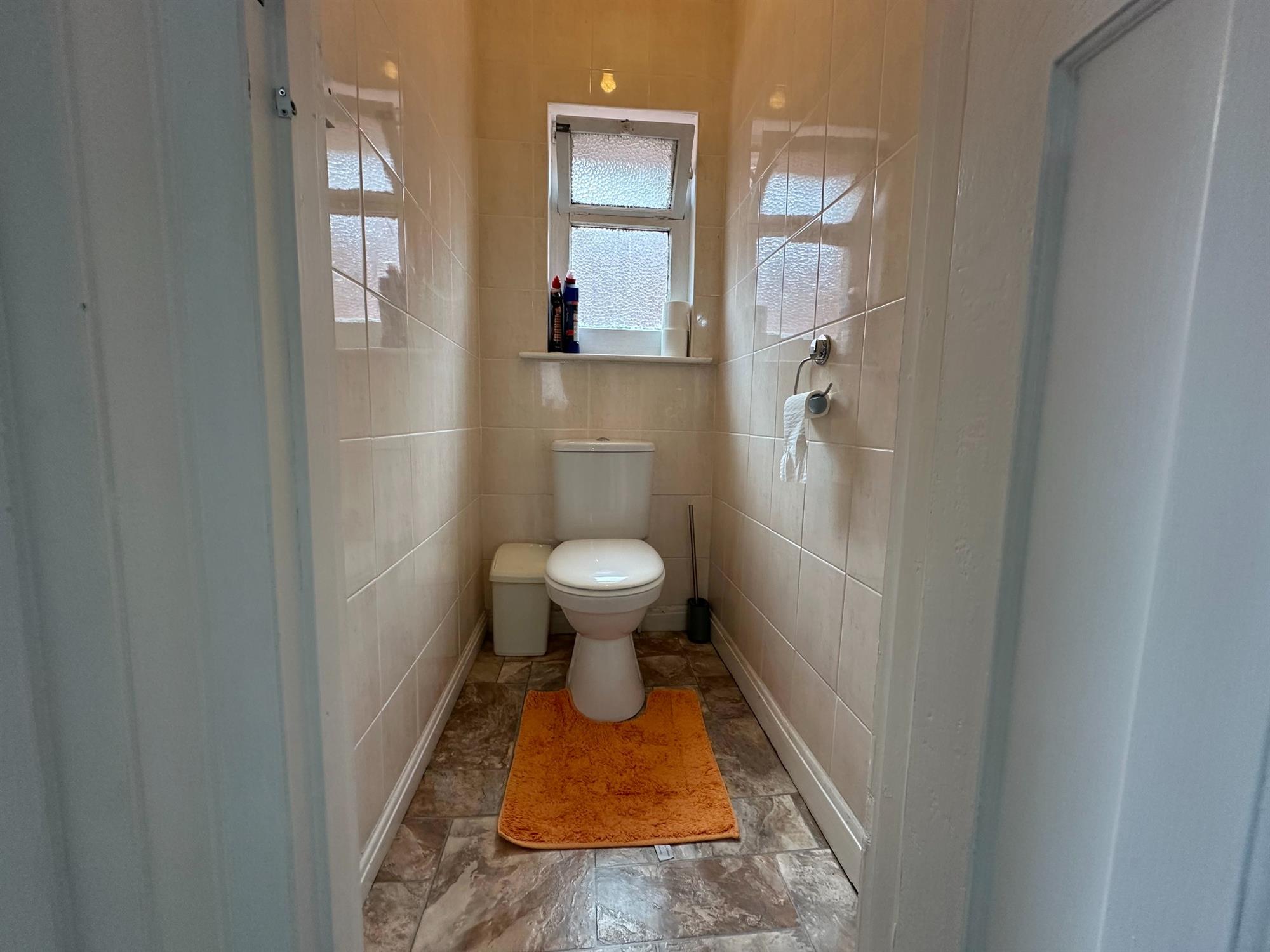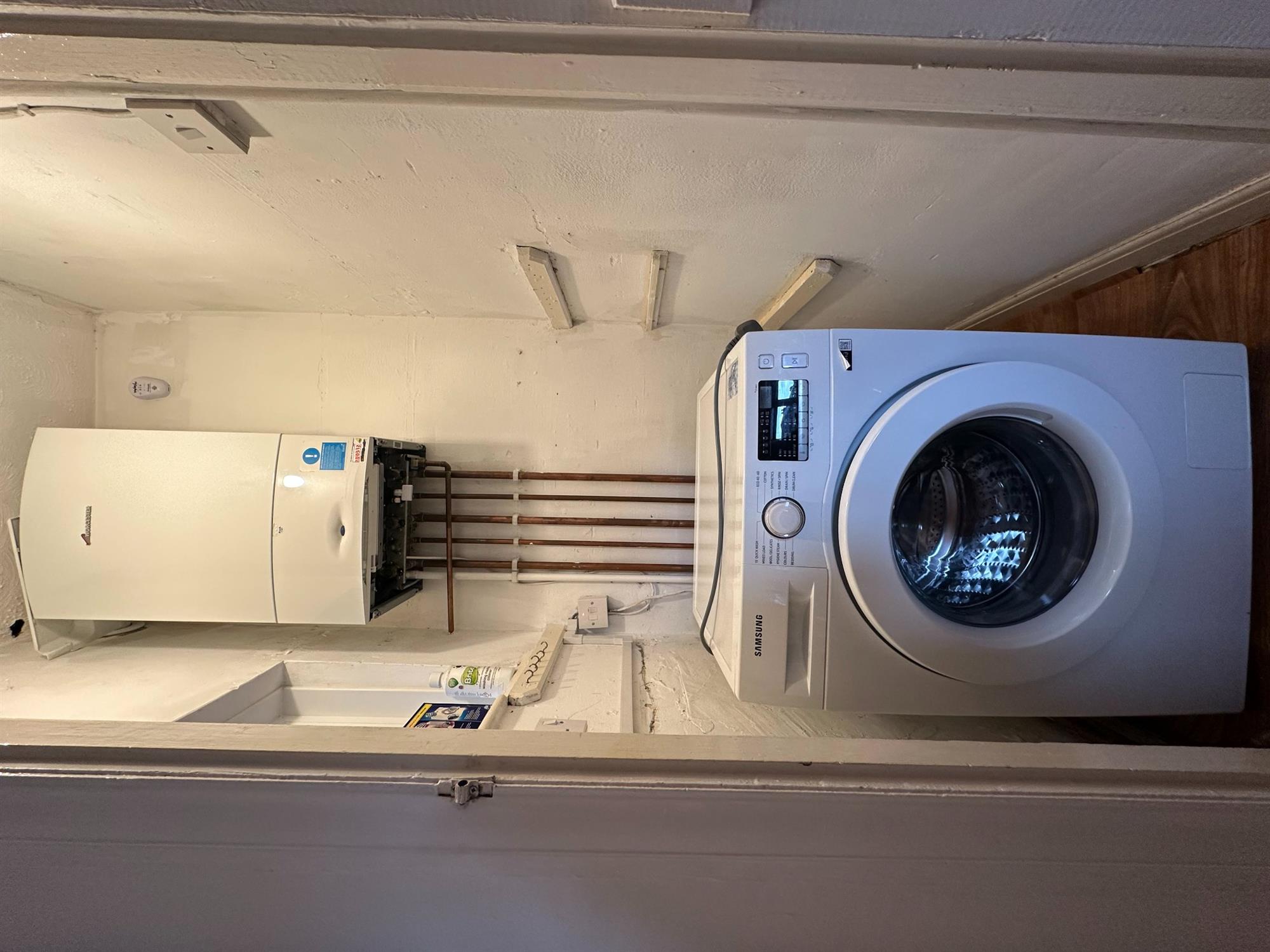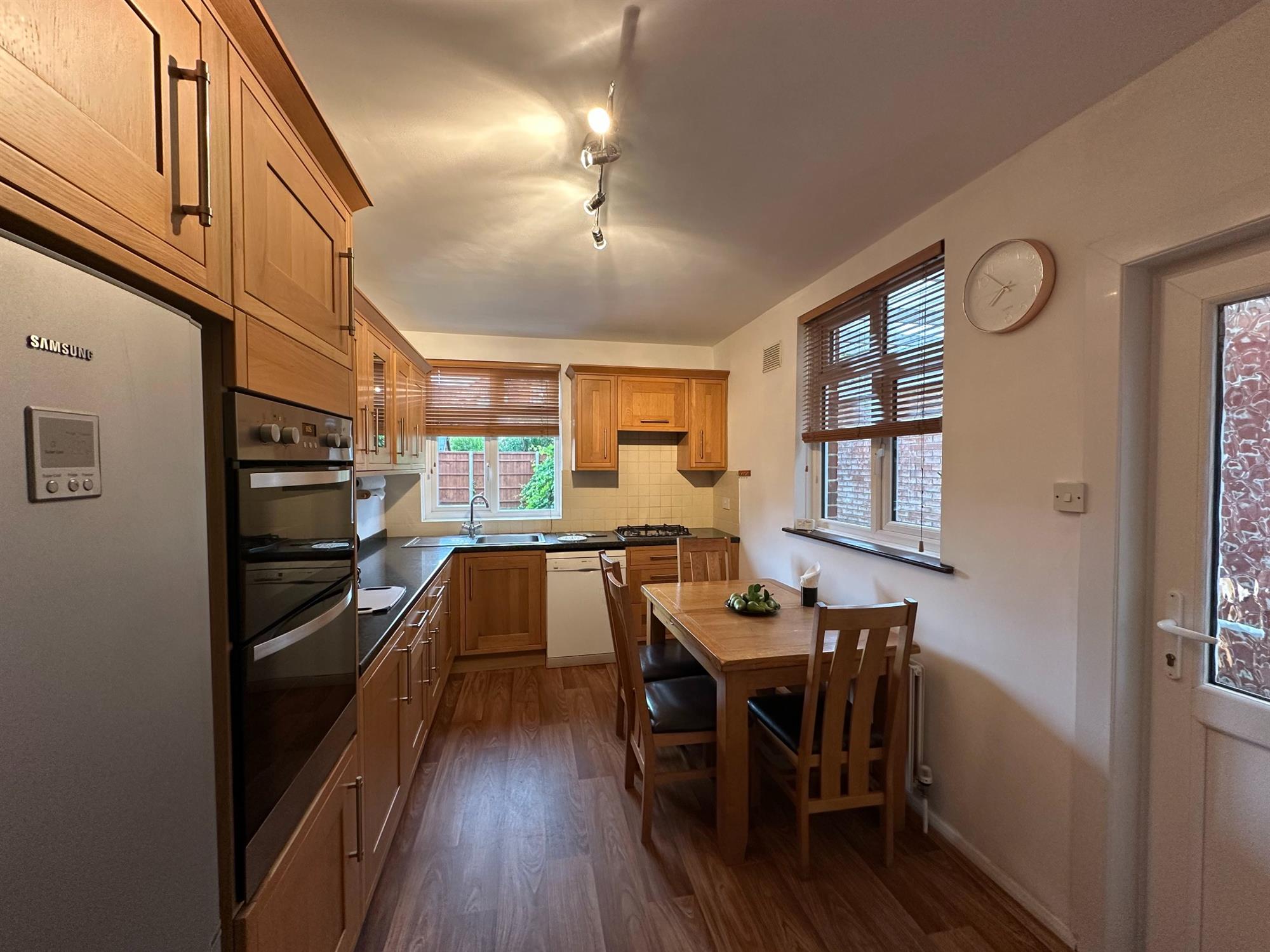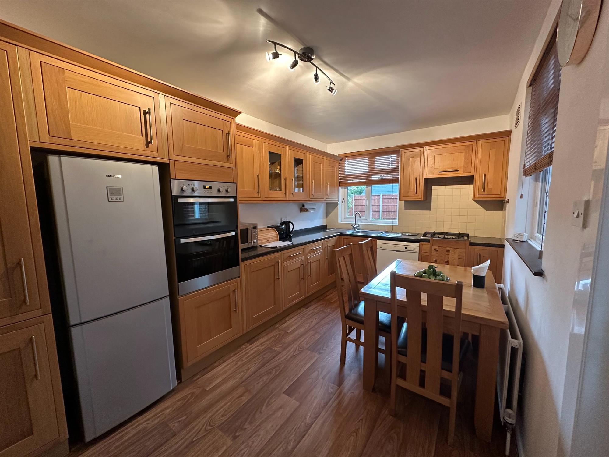 KITCHEN – Good size kitchen with various wall and base units with window to rear. Appliances consist of gas hob, electric double oven, fridge/freezer and dishwasher. Window to rear and side. Cupboard off houses boiler and washing machine.