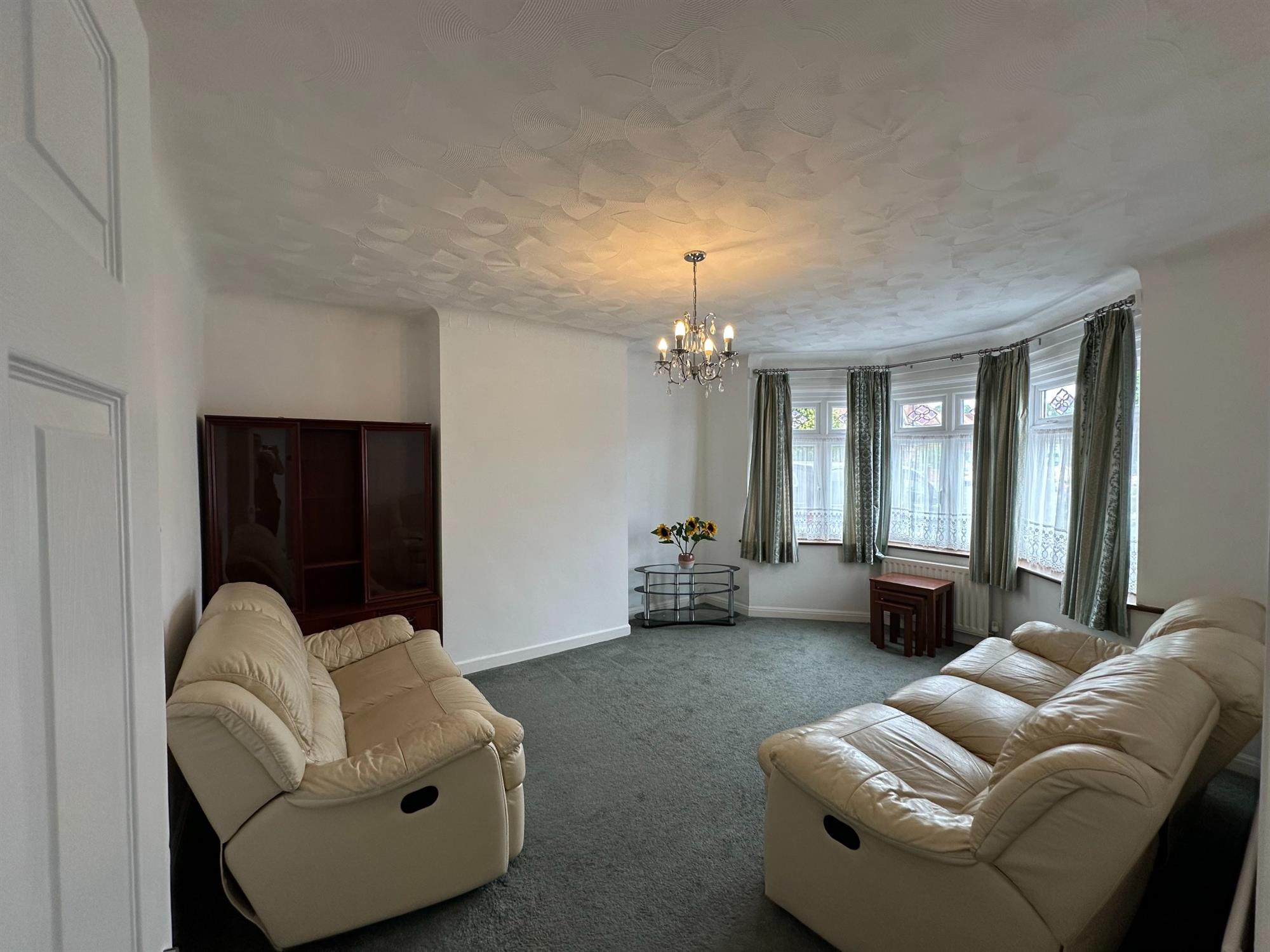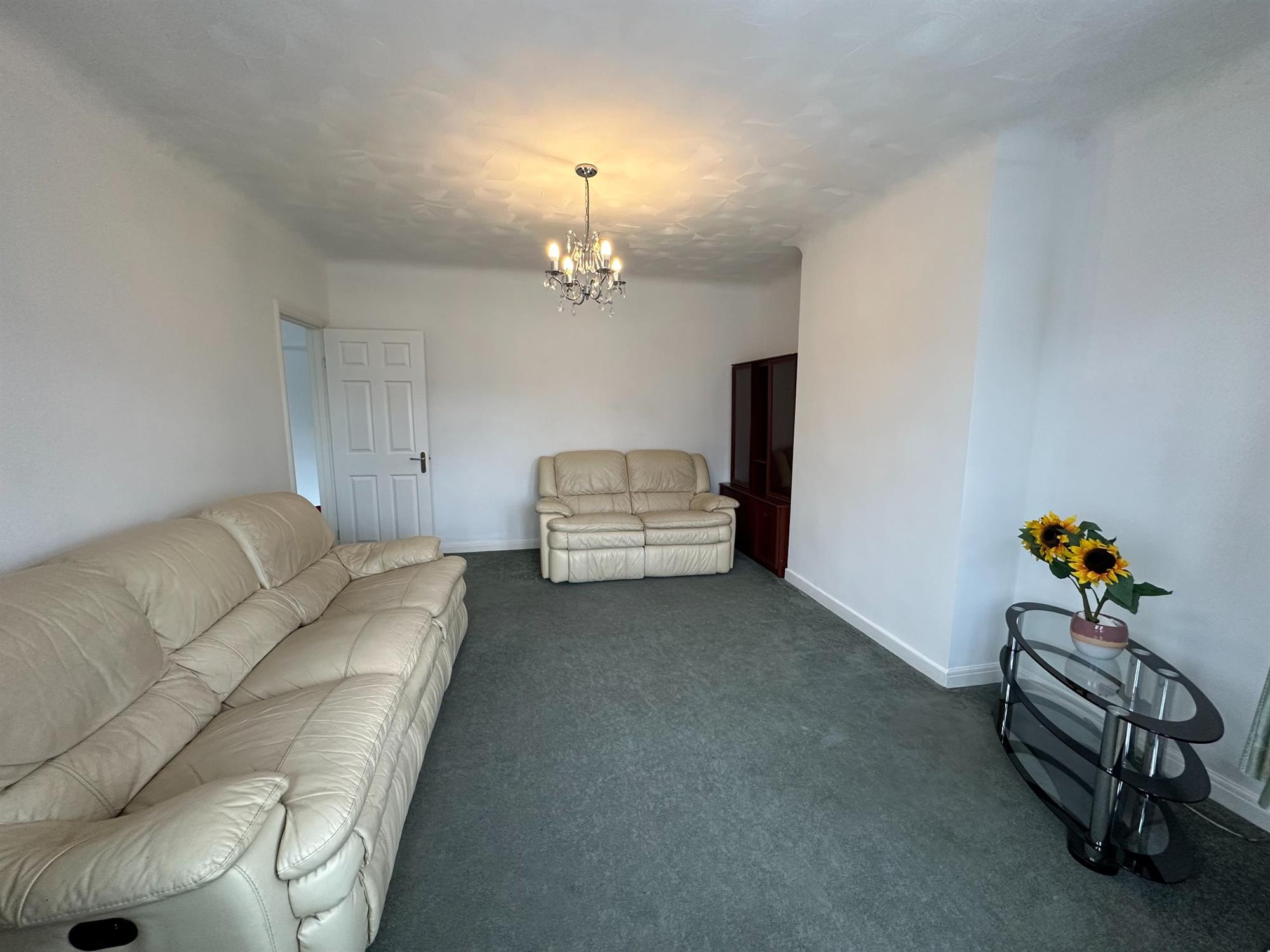 LOUNGE – Carpeted flooring with large bay window to front. Furnishing consist of: 2 x leather sofas, wall unit, TV unit and nest of tables.