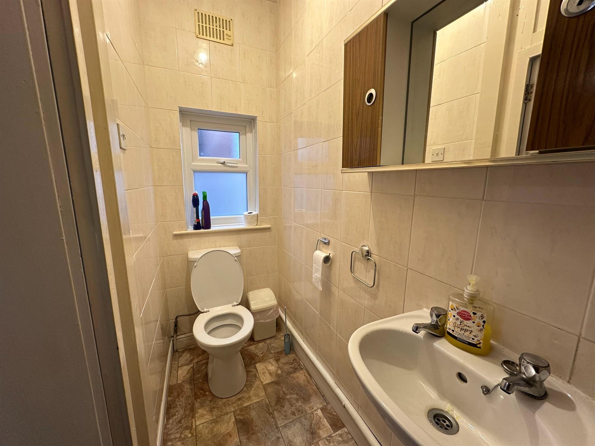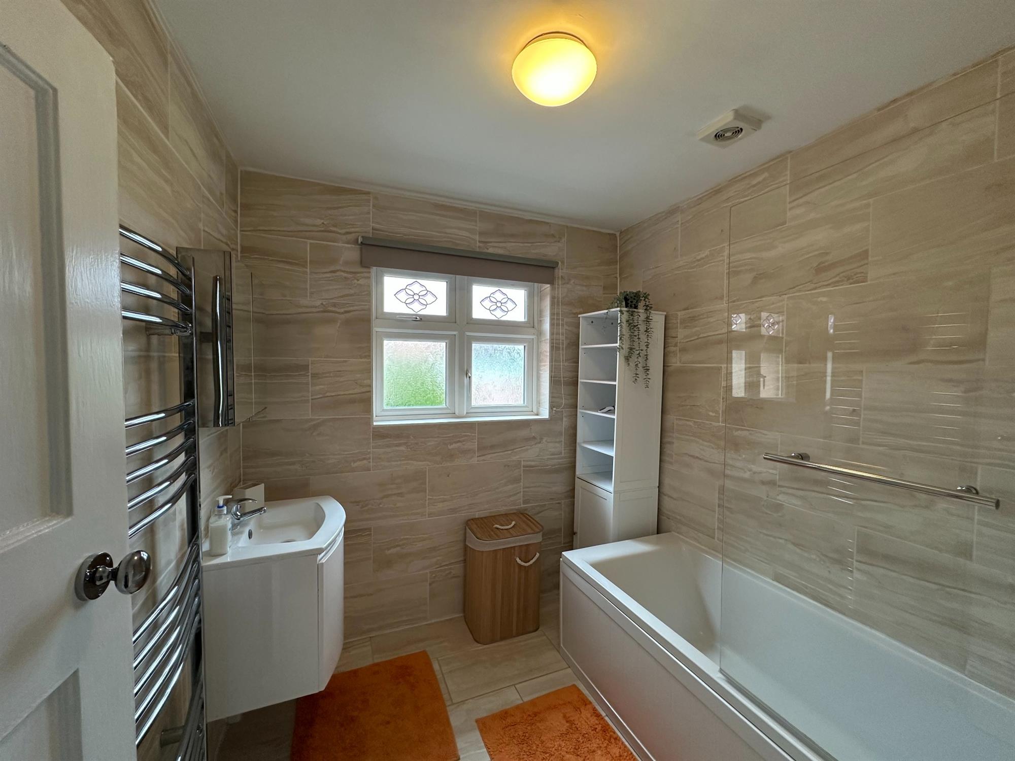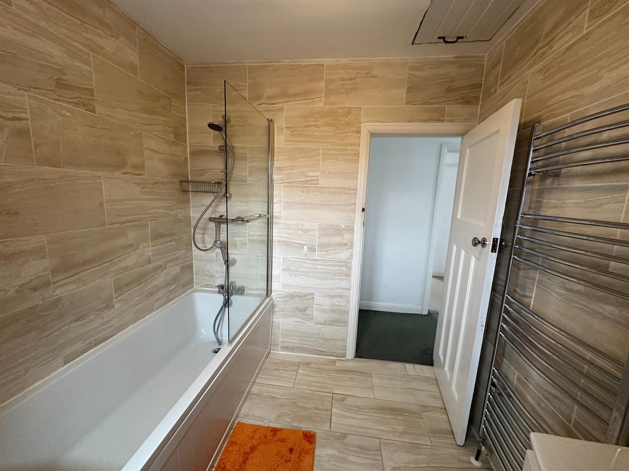 FAMILY BATHROOM – White suite with sink with vanity beneath and bath with shower over. Window to front.