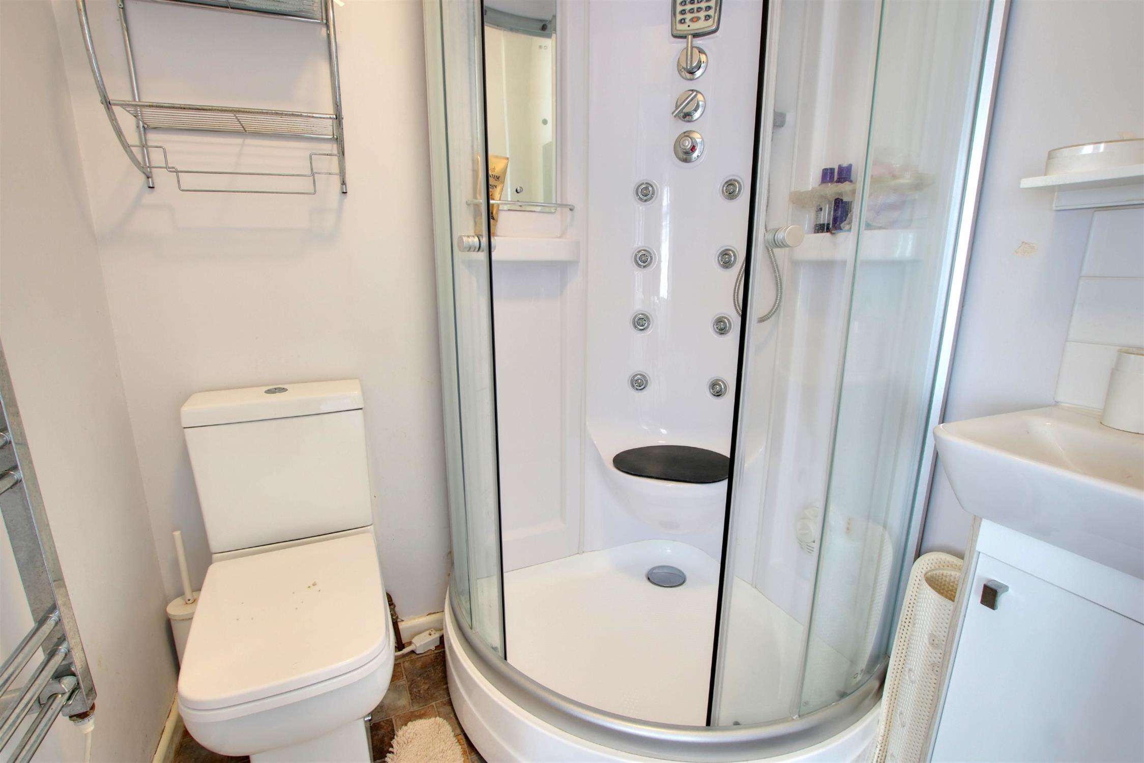 Two double glazed obscure glass windows to side aspect. Panelled bath with mixer tap. Corner shower cubcile with electic shower. Vanity wash basin with mixer tap and cupboard under and low level w.c. Additional fitted storage cupboards. Part tiled walls.