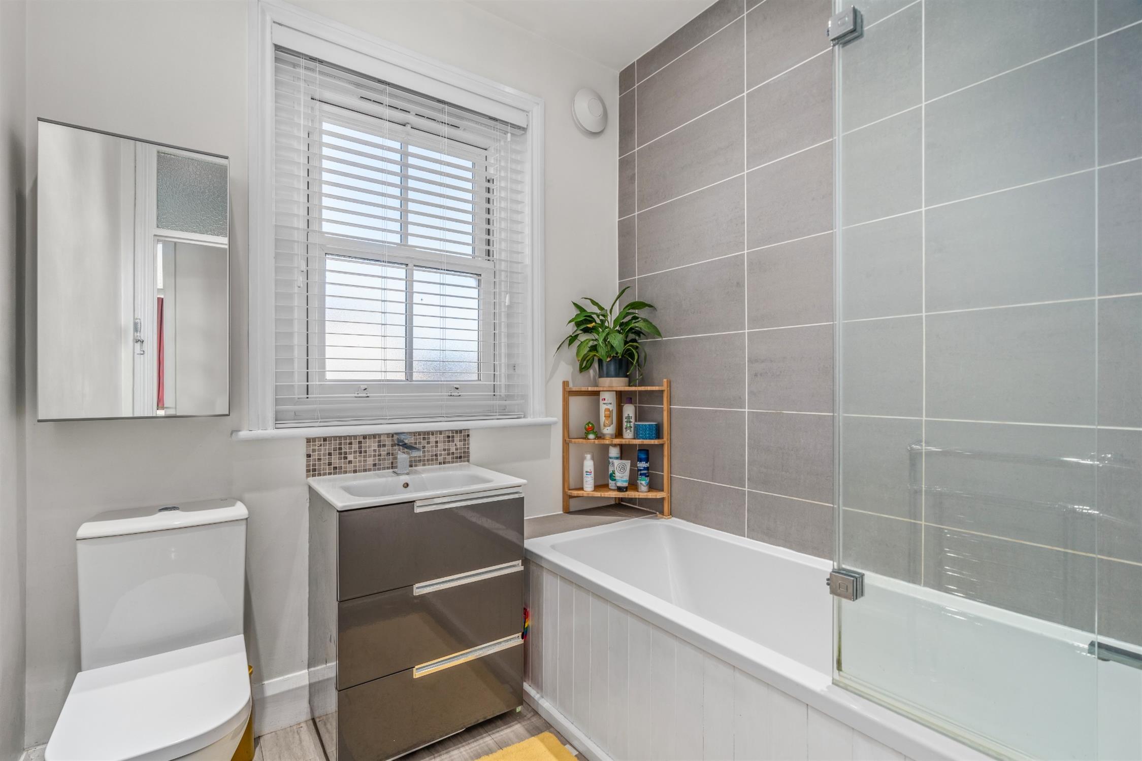 Skimmed ceiling. Double-glazed obscure window to front aspect. Partially tiled. Panel enclosed bath with shower over and glass shower screen, wash hand basin with storage under and tiled splash back and low level w.c. Heated towel rail with chrome finish.