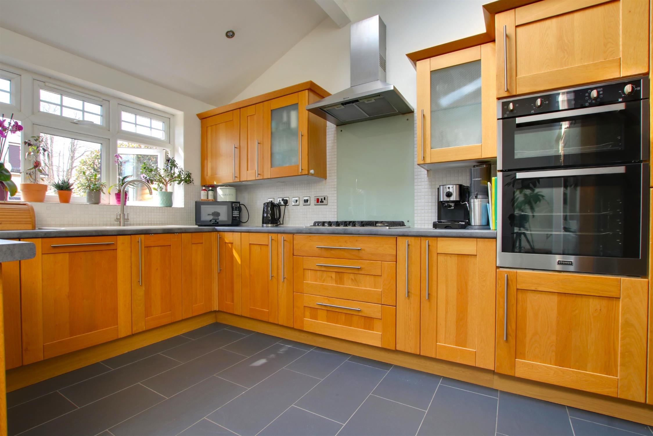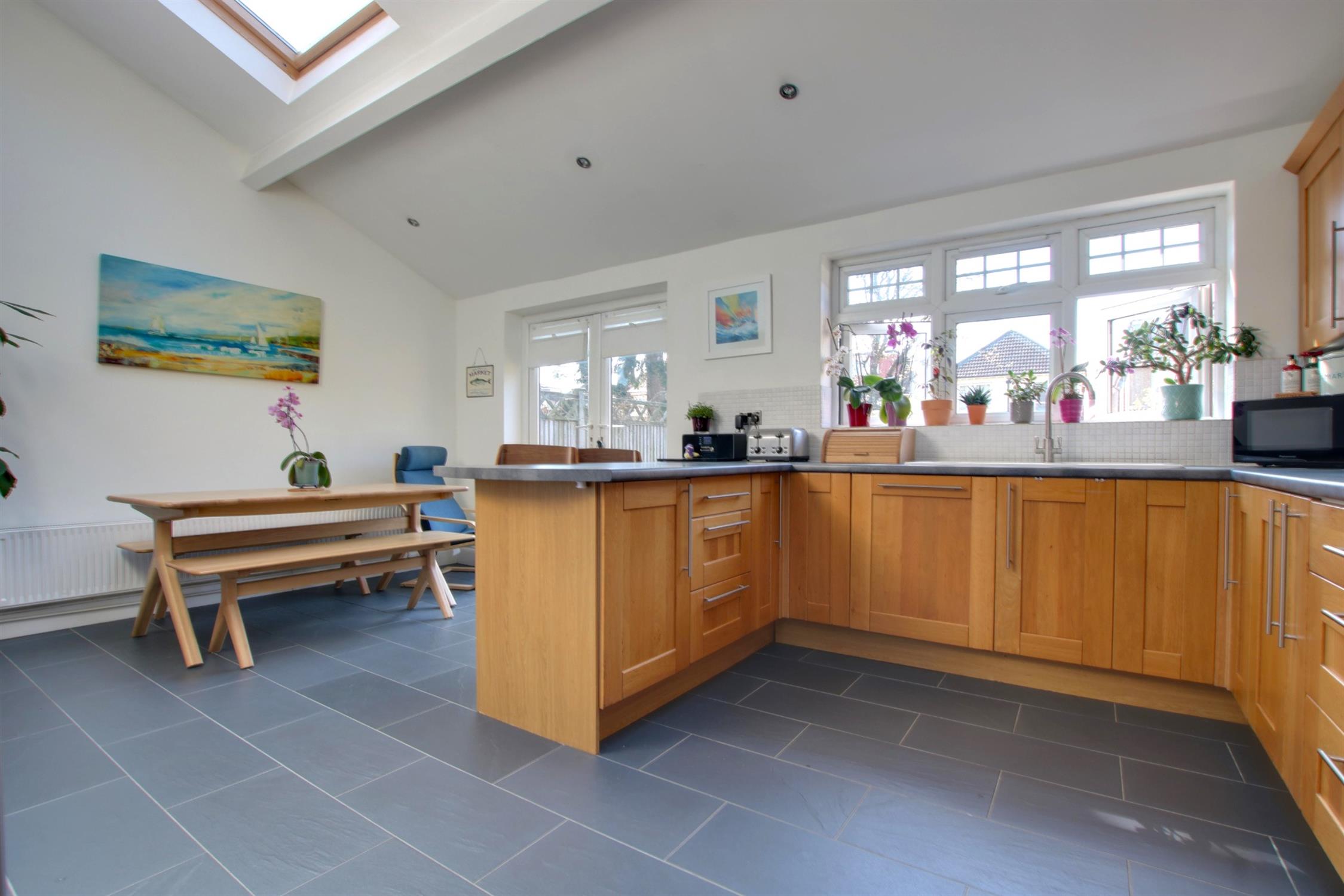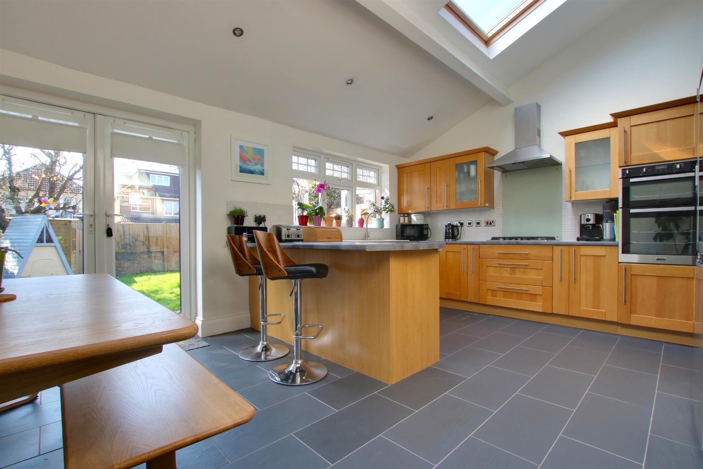 Skimmed ceiling. Two velux windows. Spotlights. Double glazed patio doors to the rear garden. Double glazed windows to rear aspect. A comprehensive range of wall mounted and base units with work top over. Integrated double oven. Integrated gas hob with extractor over. Butler style one and a half bowl sink and drainer. Doorway to:-