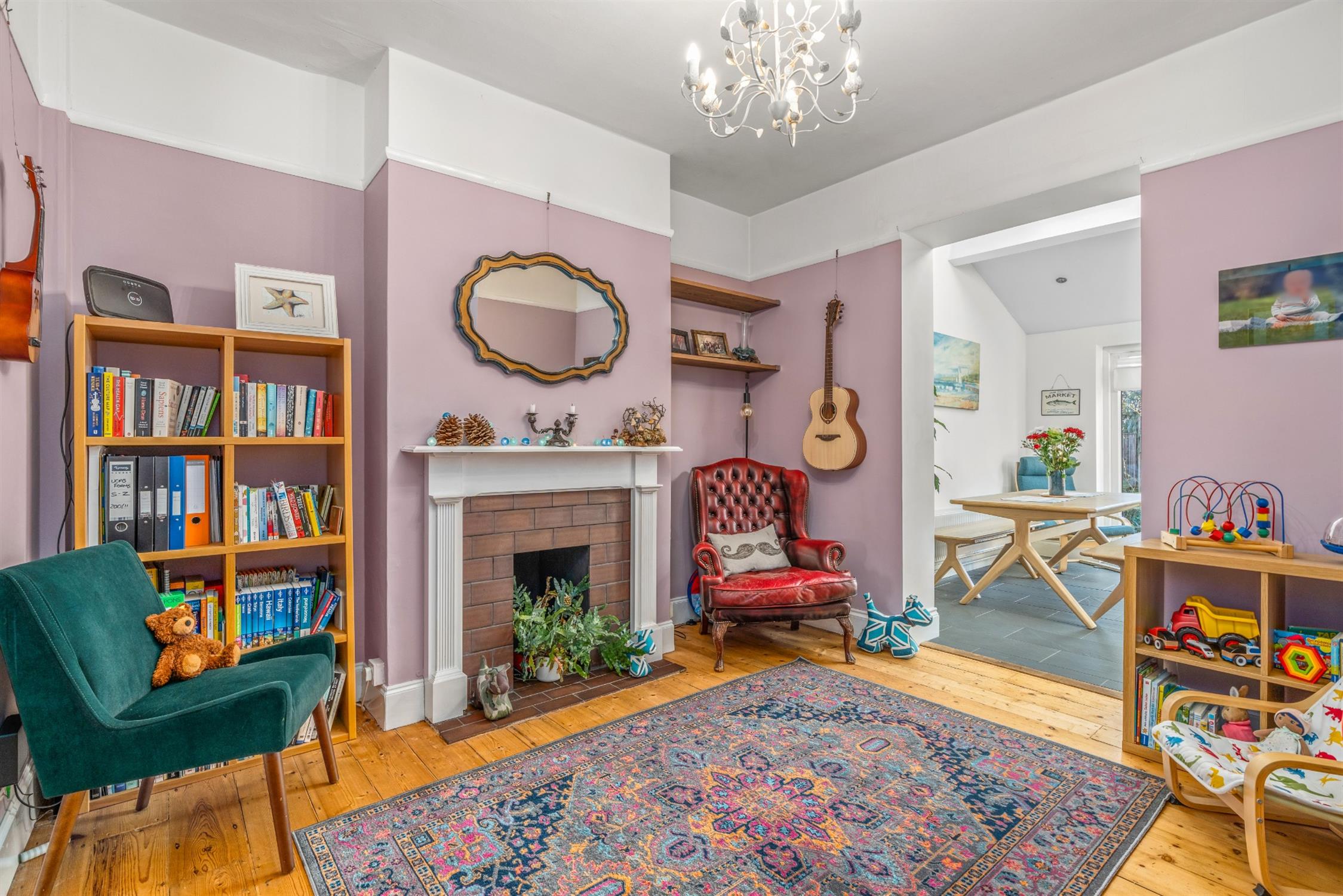 Skimmed ceiling. Picture rail. Opening to kitchen/dining room. Exposed wooden flooring.