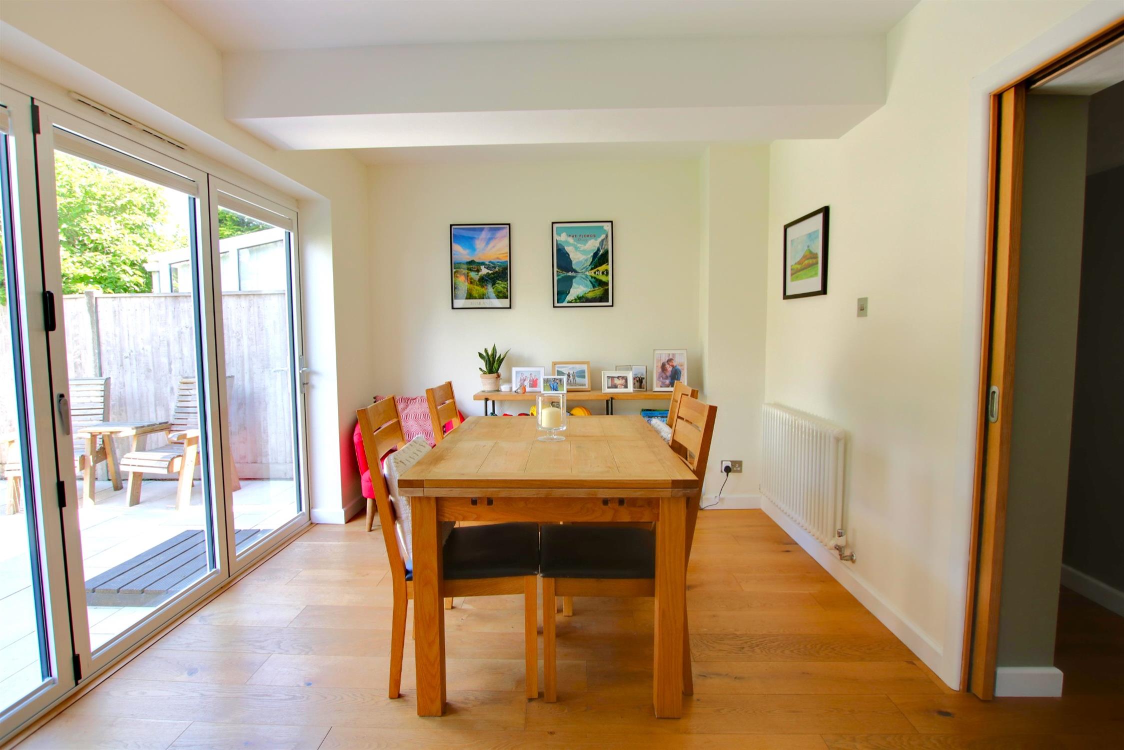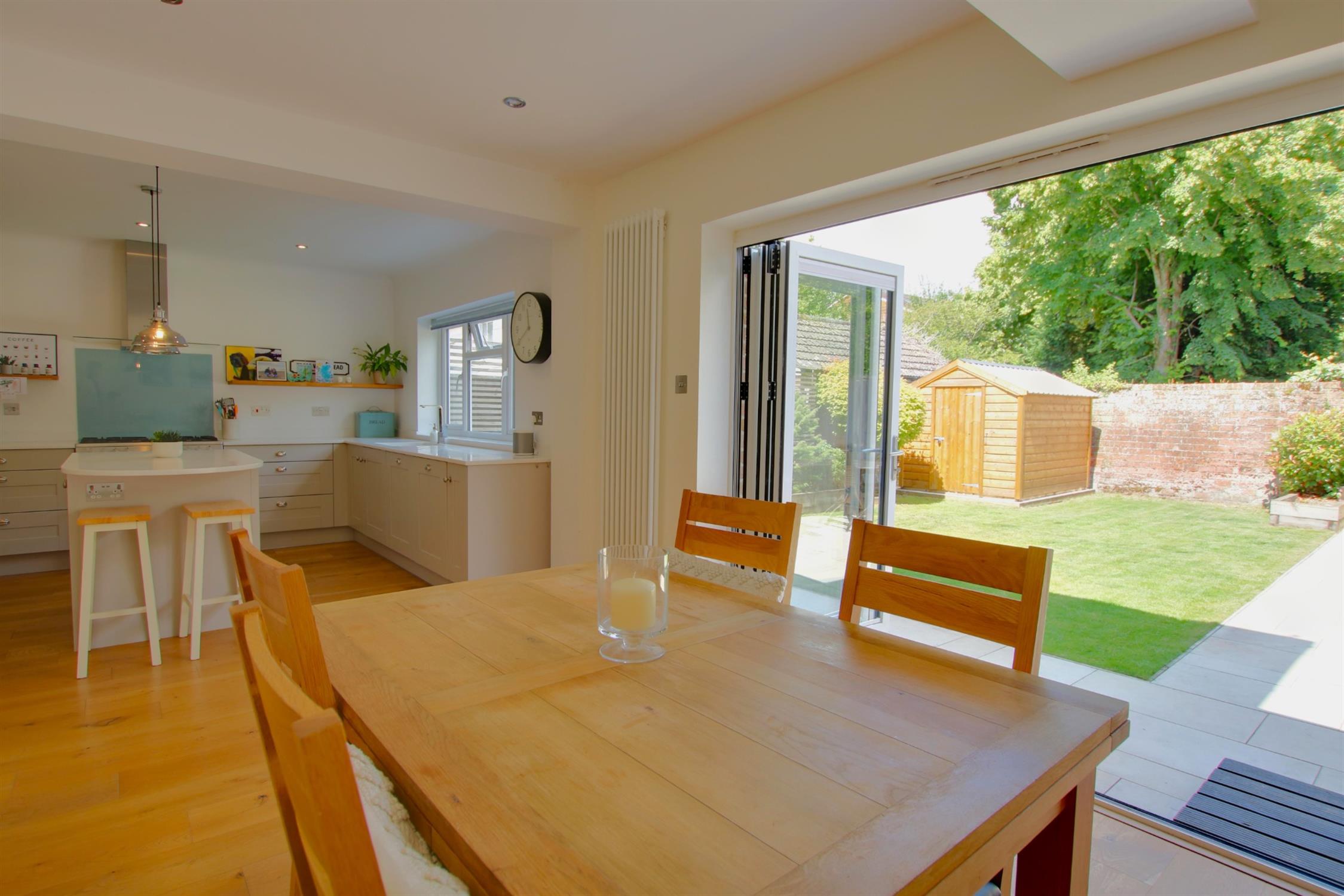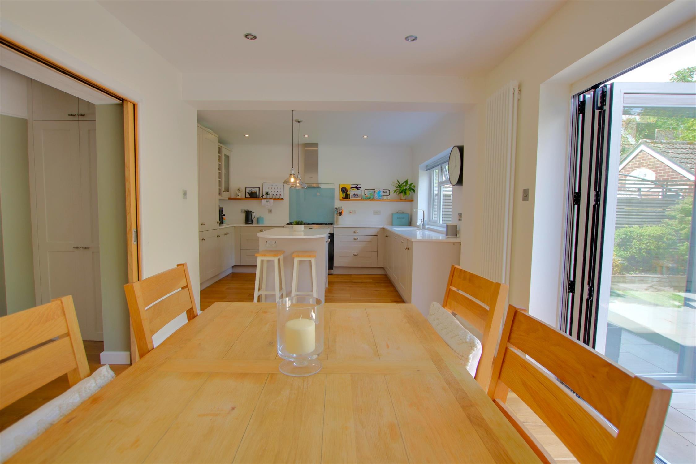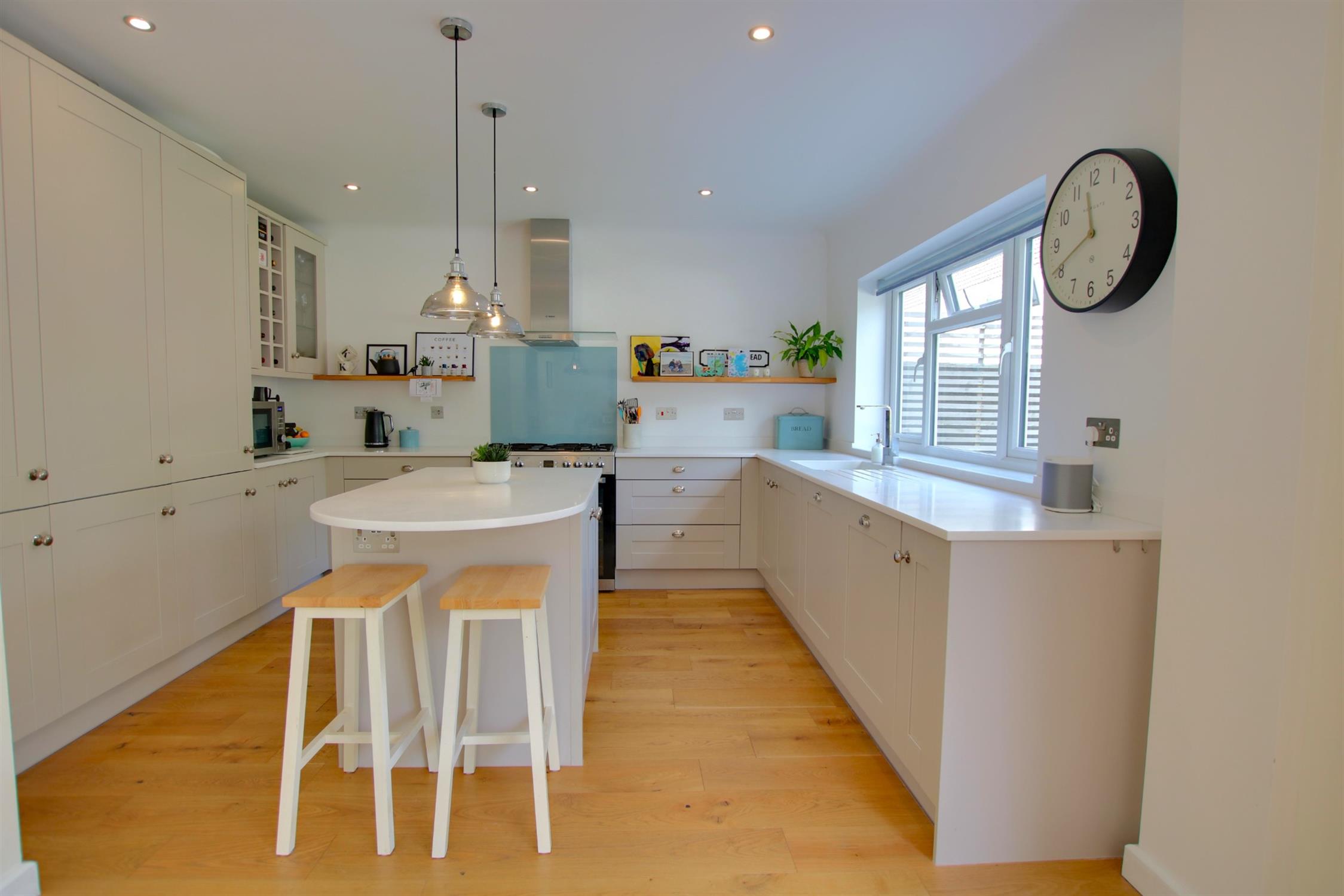 Double glazed window to rear aspect. Double glazed bi-fold doors opening onto rear garden. Smooth ceiling with recessed lighting. Sink with mixer tap and cupboard under. A range of matching eye level and base mounted units with cushion close action and tristone worktop over. Pull out pantry cupboard. Integrated fridge and freezer. Integrated dishwasher. Space for range style oven with extractor over. Island unit with tristone worktop and breakfast bar. Two radiators. Wood flooring.