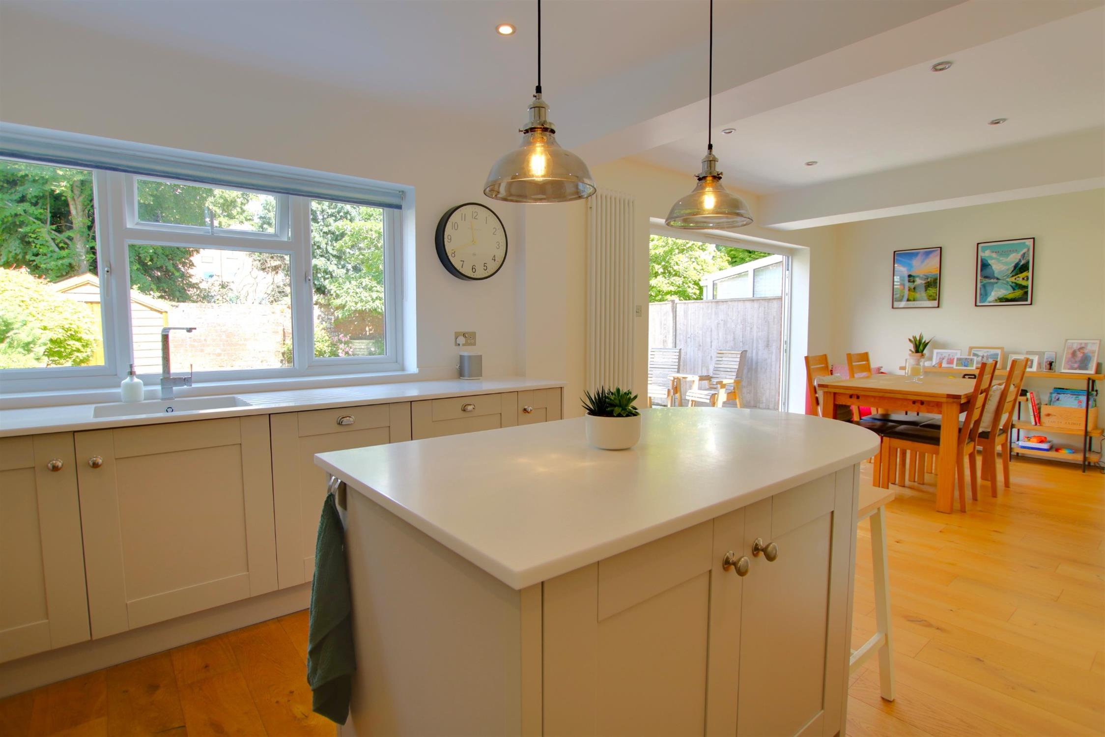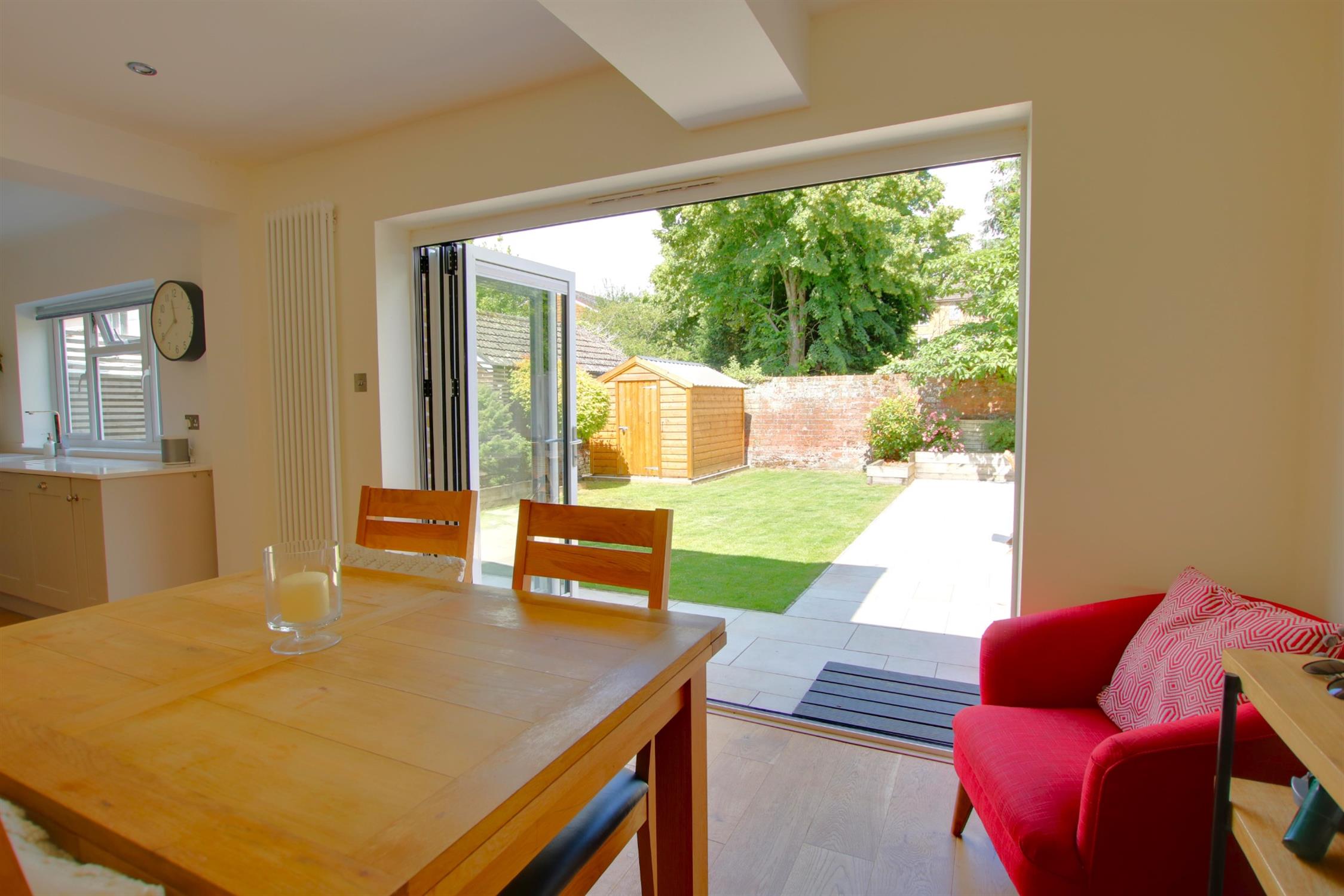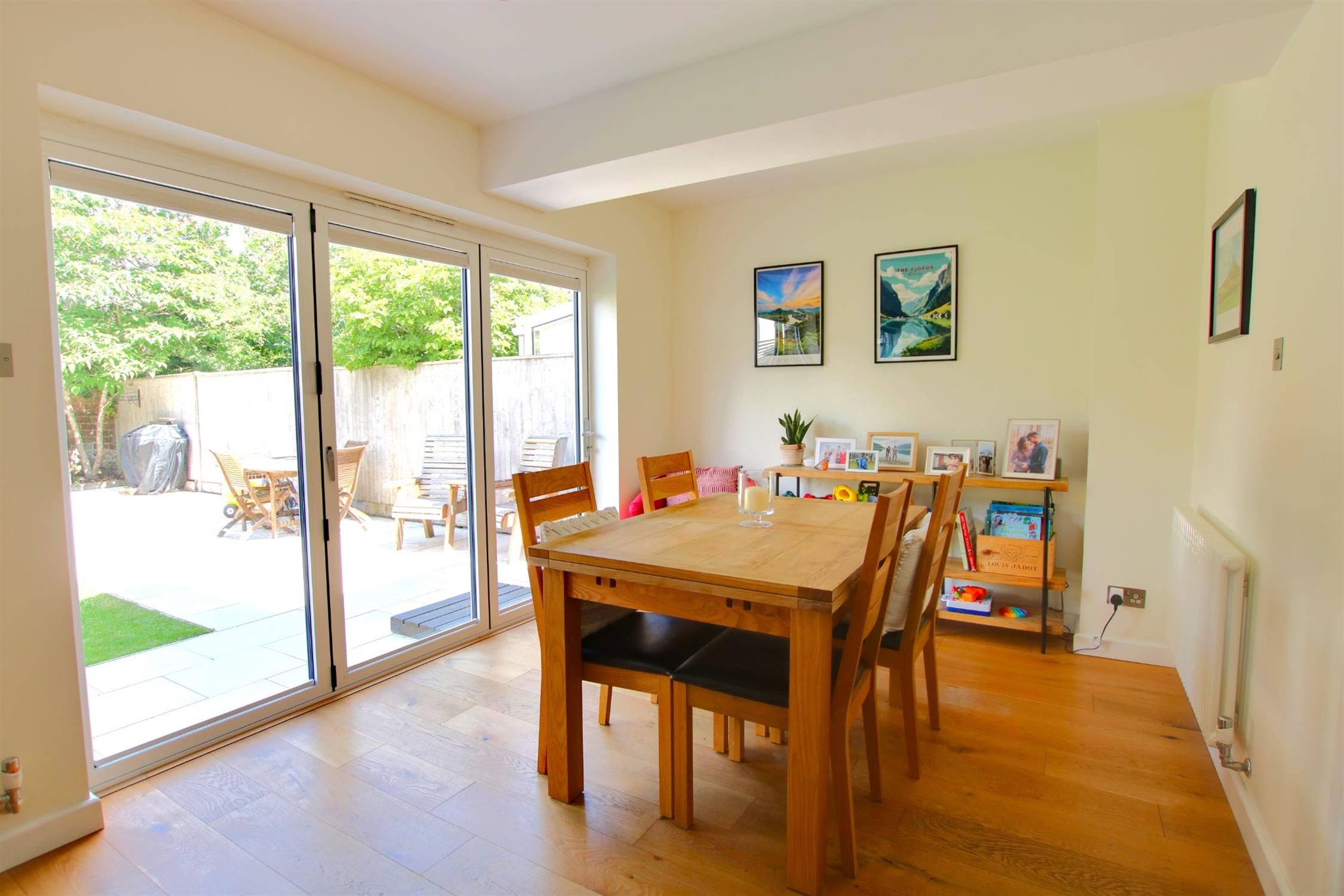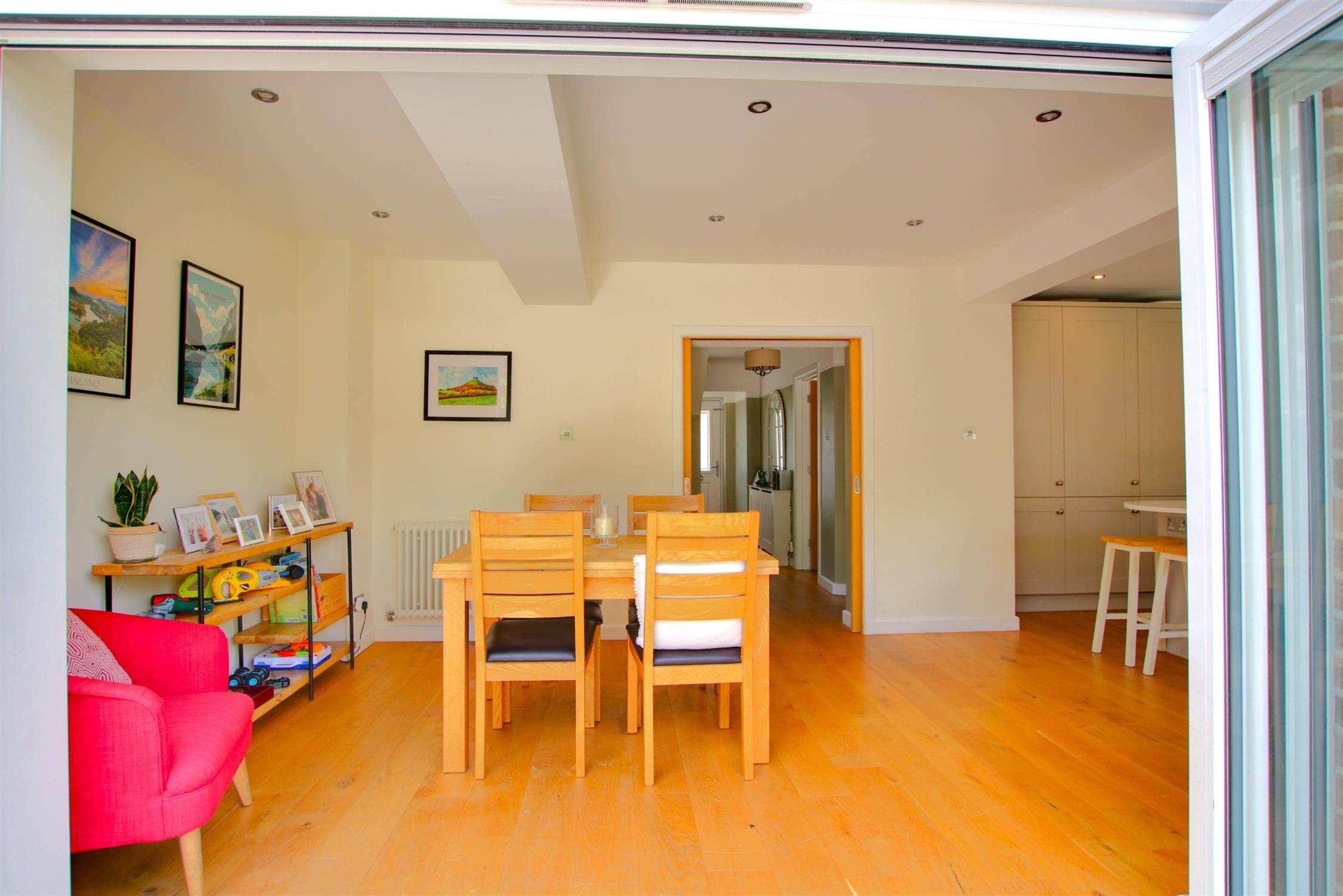 Double glazed window to rear aspect. Double glazed bi-fold doors opening onto rear garden. Smooth ceiling with recessed lighting. Sink with mixer tap and cupboard under. A range of matching eye level and base mounted units with cushion close action and tristone worktop over. Pull out pantry cupboard. Integrated fridge and freezer. Integrated dishwasher. Space for range style oven with extractor over. Island unit with tristone worktop and breakfast bar. Two radiators. Wood flooring.