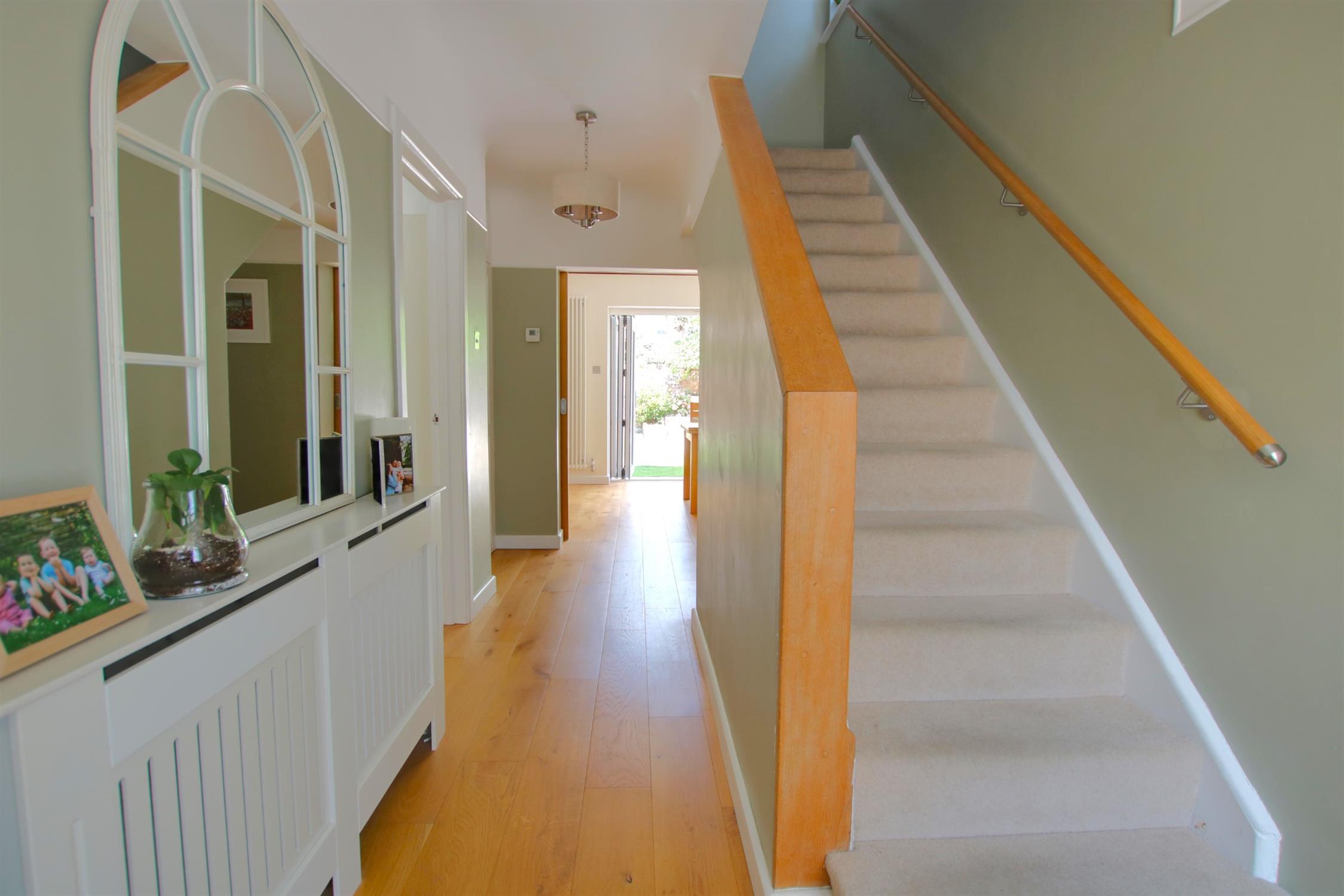 Smooth ceiling with recessed lighting. Stairs to first floor. Under stairs storage cupboard. Radiator. Oak flooring. Cloaks cupboard. Utility cupboard with space and plumbing for washing machine. Space for tumble dryer. Wall mounted boiler. Door to side passageway. Doors to all rooms.
