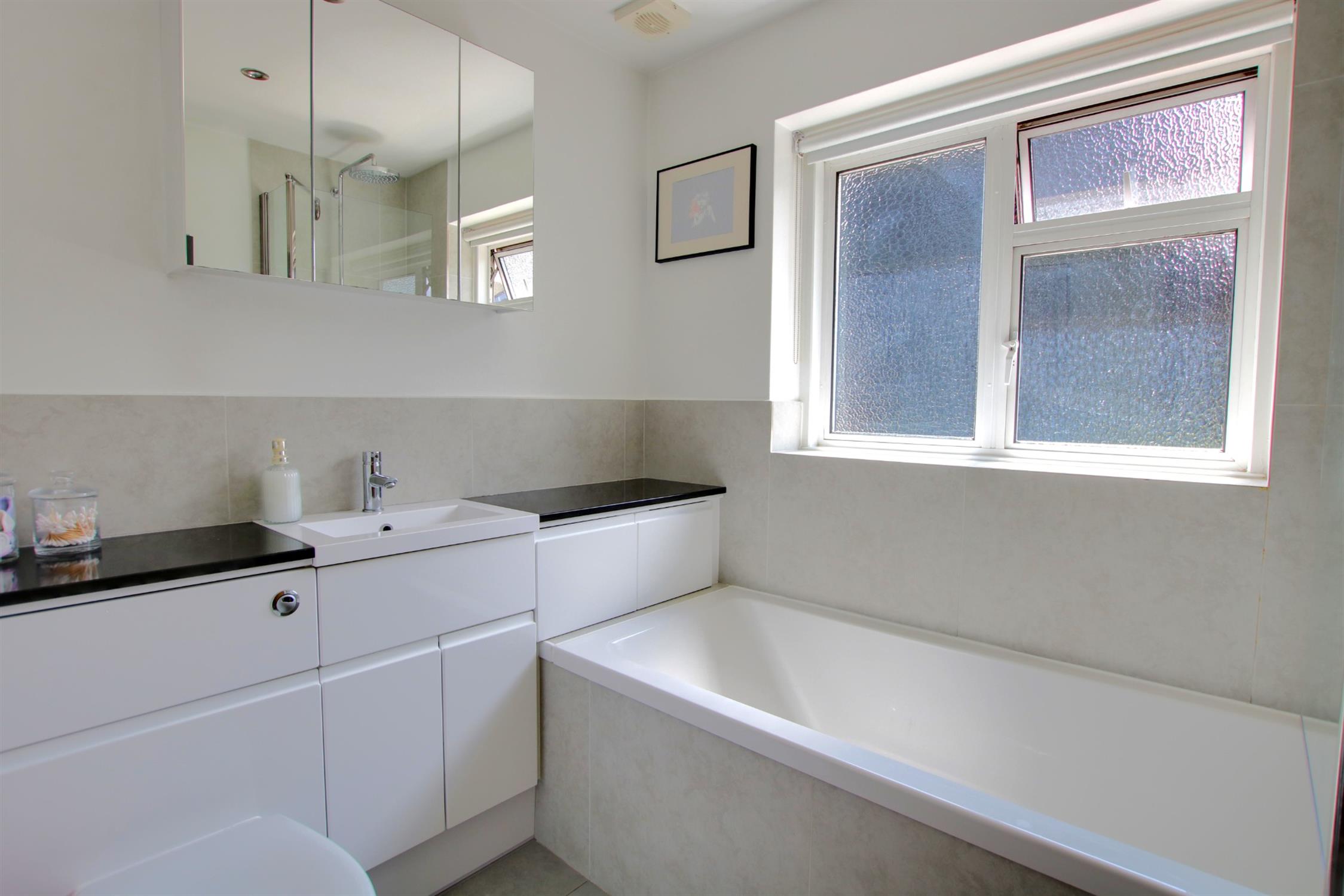 Double glazed obscure glass window to front aspect. Smooth ceiling with recessed lighting. Extractor. Bath with mixer tap, rainfall shower head and shower attachment, vanity wash basin with mixer tap and cupboard under and concealed cistern w.c. Heated towel rail. Tiled flooring.