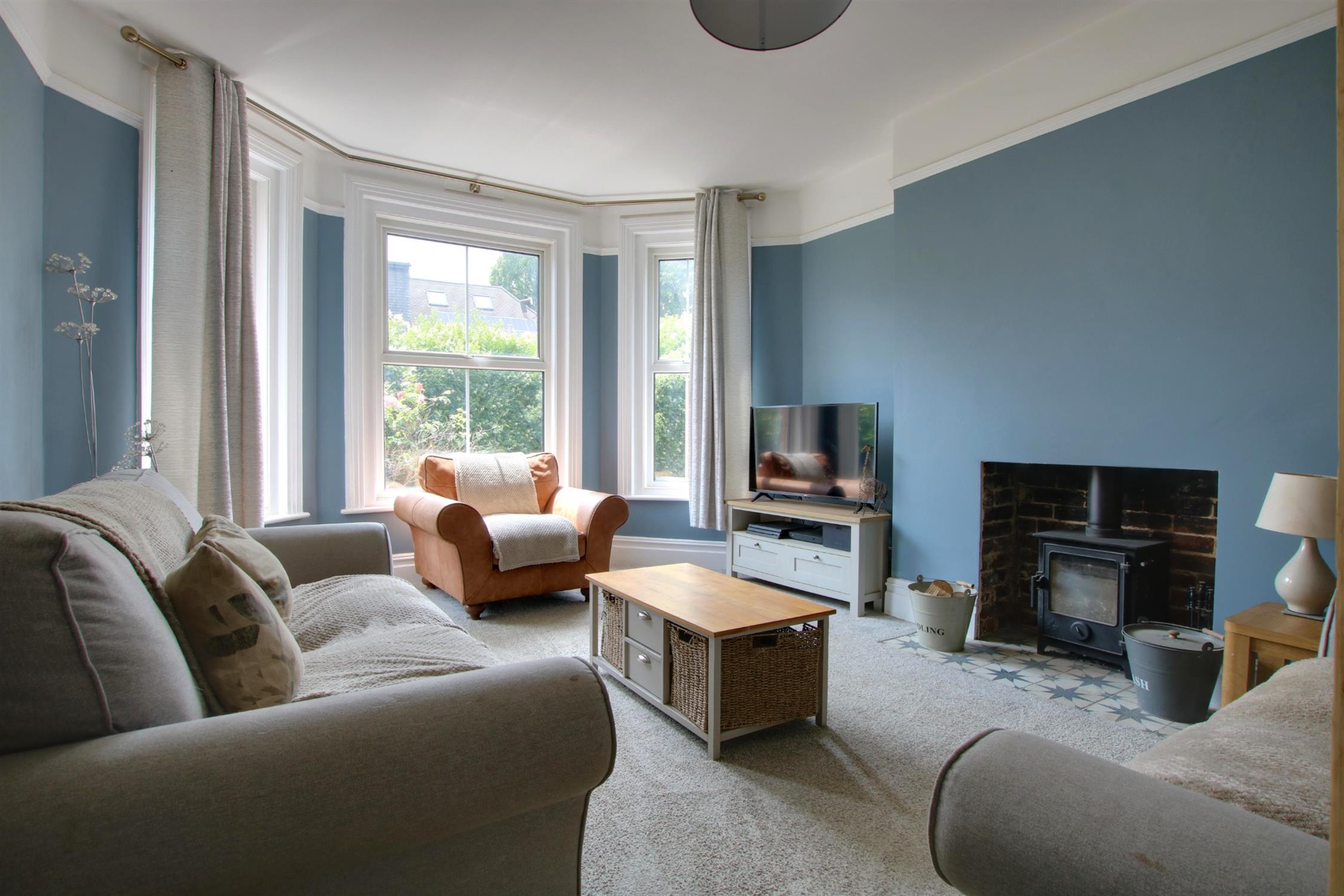 Carpeted. Picture rails and coving. Wood burning stove. Double-glazed bay window to front aspect. Radiator.
