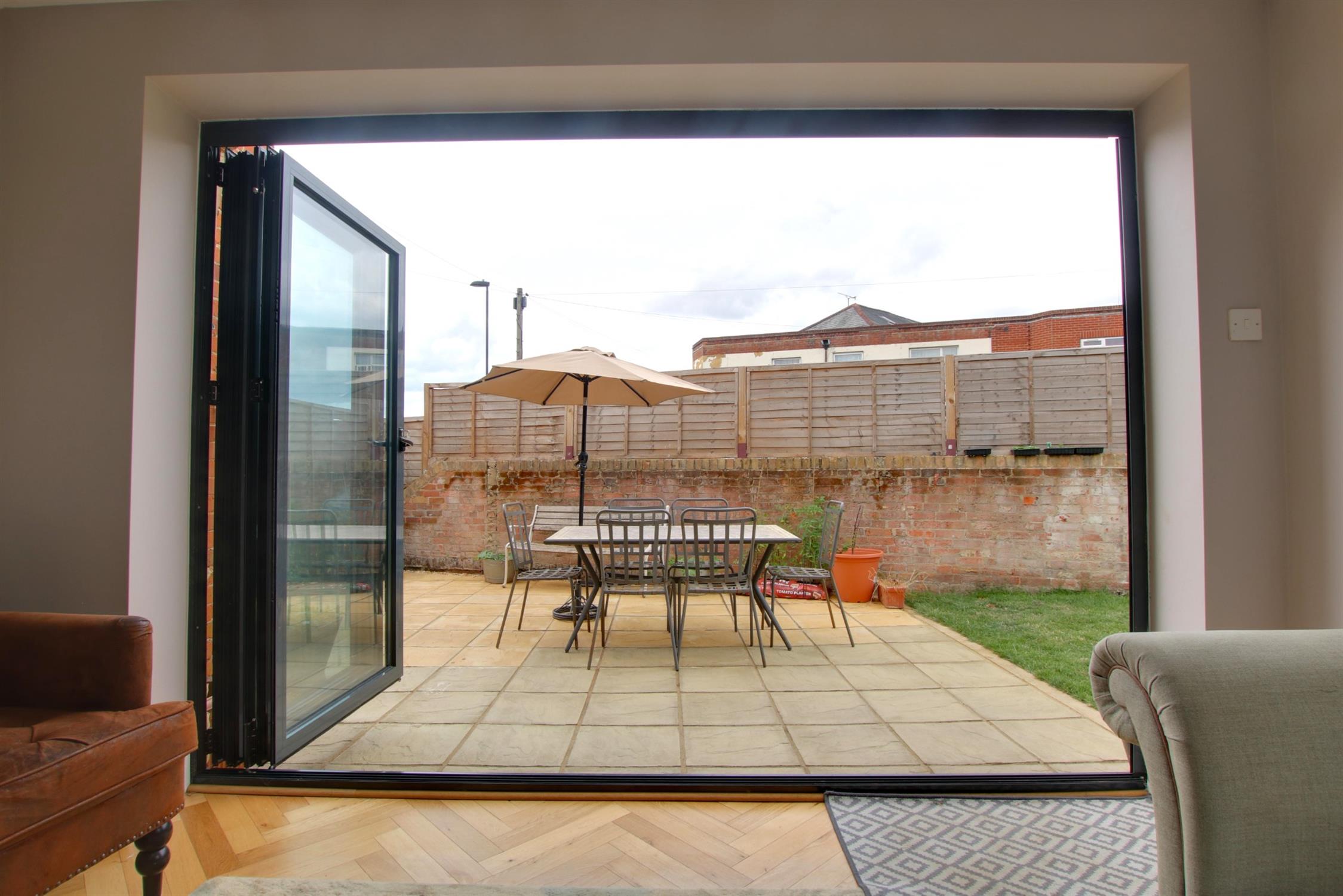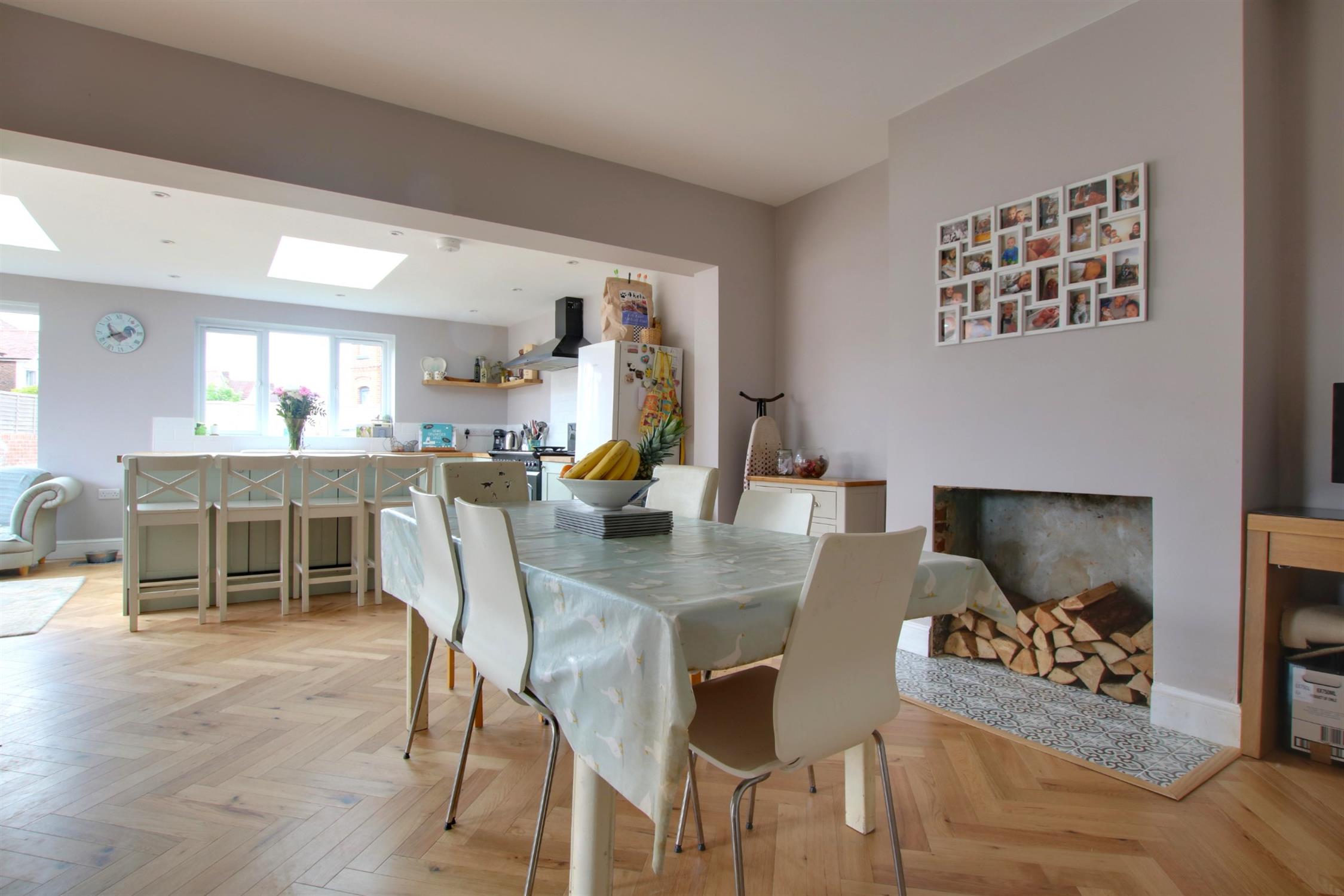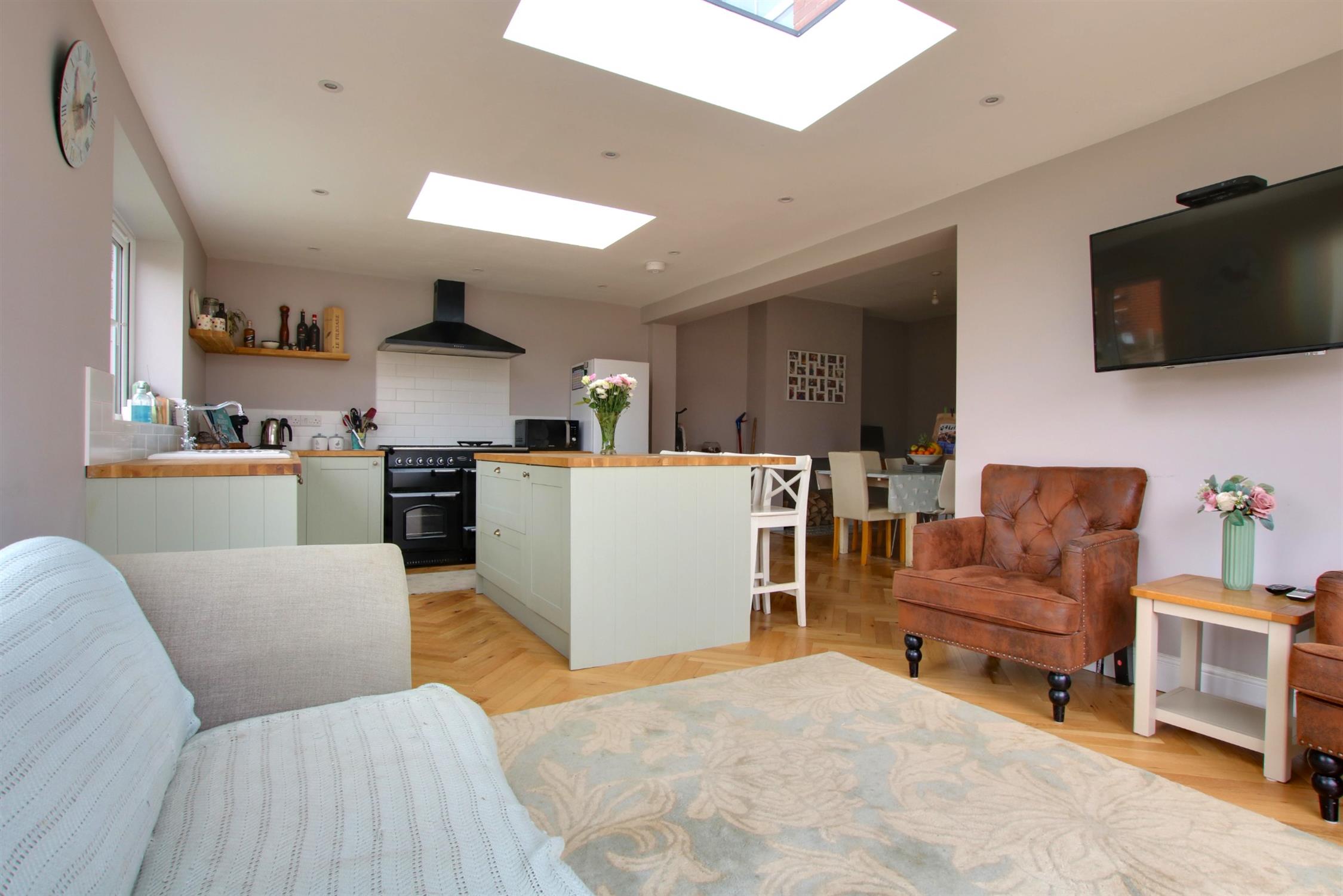 Herringbone wooden flooring. Kitchen comprises base units and separate island with breakfast bar. Tiled splashback. Integrated dishwasher and washing machine and extractor hood. Space for a freestanding cooker and fridge-freezer. Inset ceramic sink. Two double-glazed windows to rear aspect. Two skylight windows. Bi-fold doors to garden.