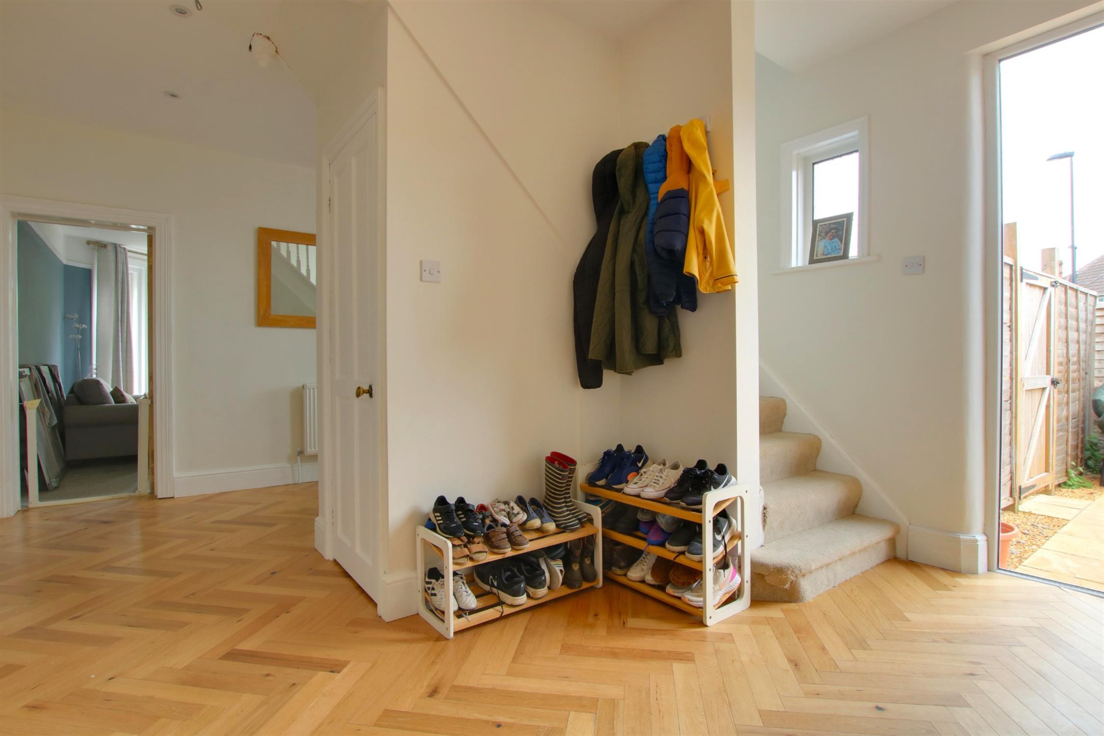 Herringbone wooden flooring. Doors to all rooms. Stairs to first floor. Understairs storage. Three double-glazed windows to side aspect. Radiator.