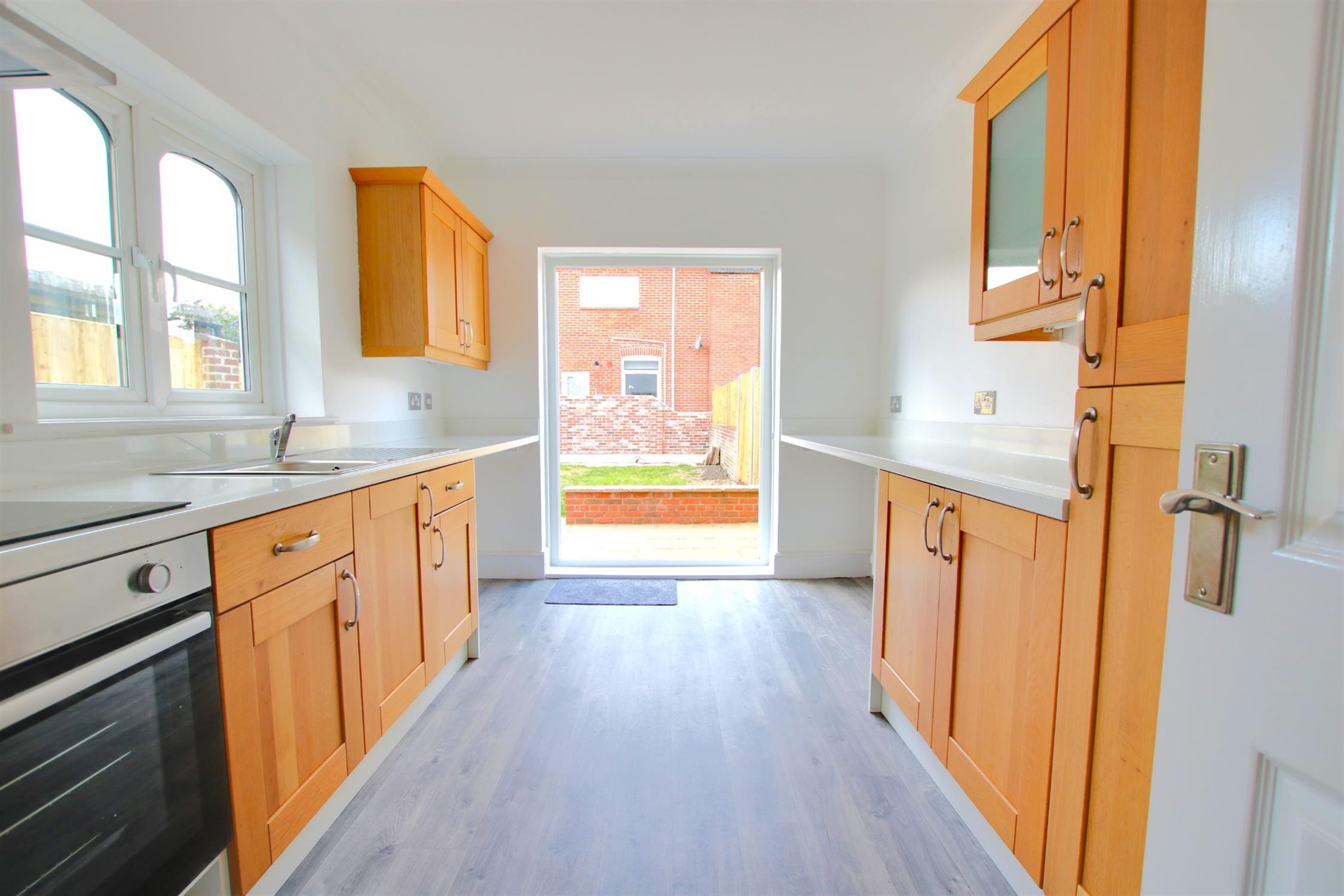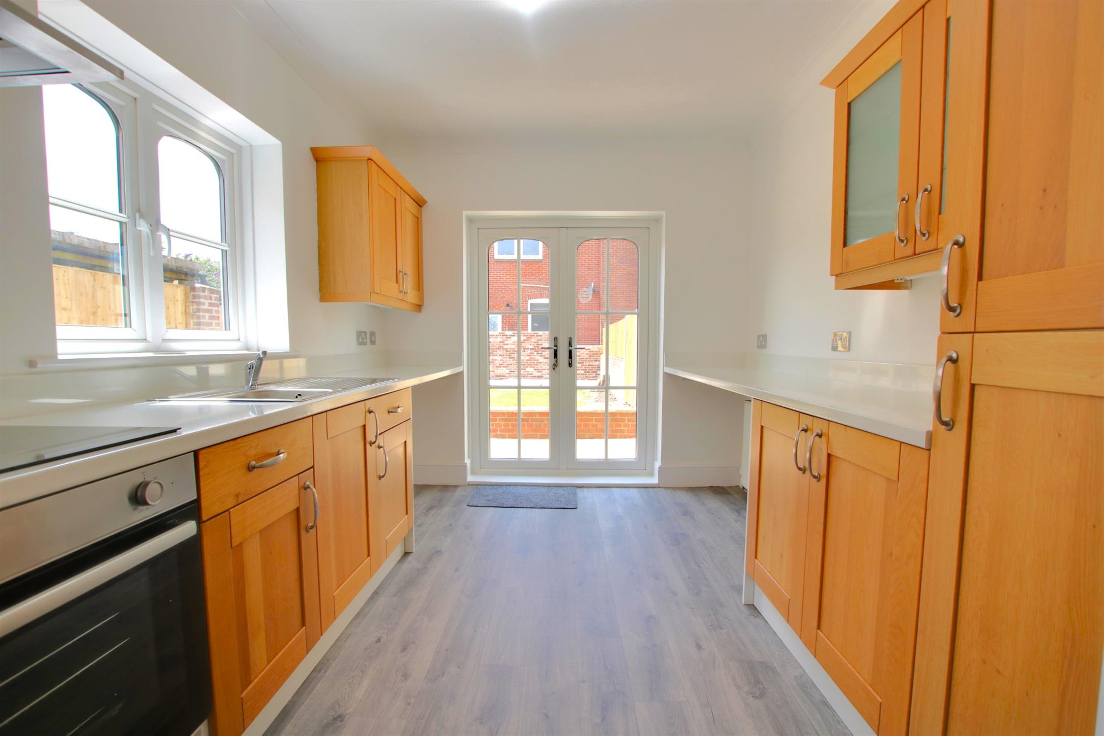 Double glazed French doors opening onto rear garden. Double glazed window to side aspect. Coving to textured ceiling. Single drainer sink unit with mixer tap and cupboard under . A range of matching eye level and base mounted units with roll top work surface over. Built in oven with fitted four ring induction hob and extractor over. Breakfast bar. Radiator. Wall mounted boiler. Space and plumbing for washer/dryer and dishwasher. Space for fridge/freezer.