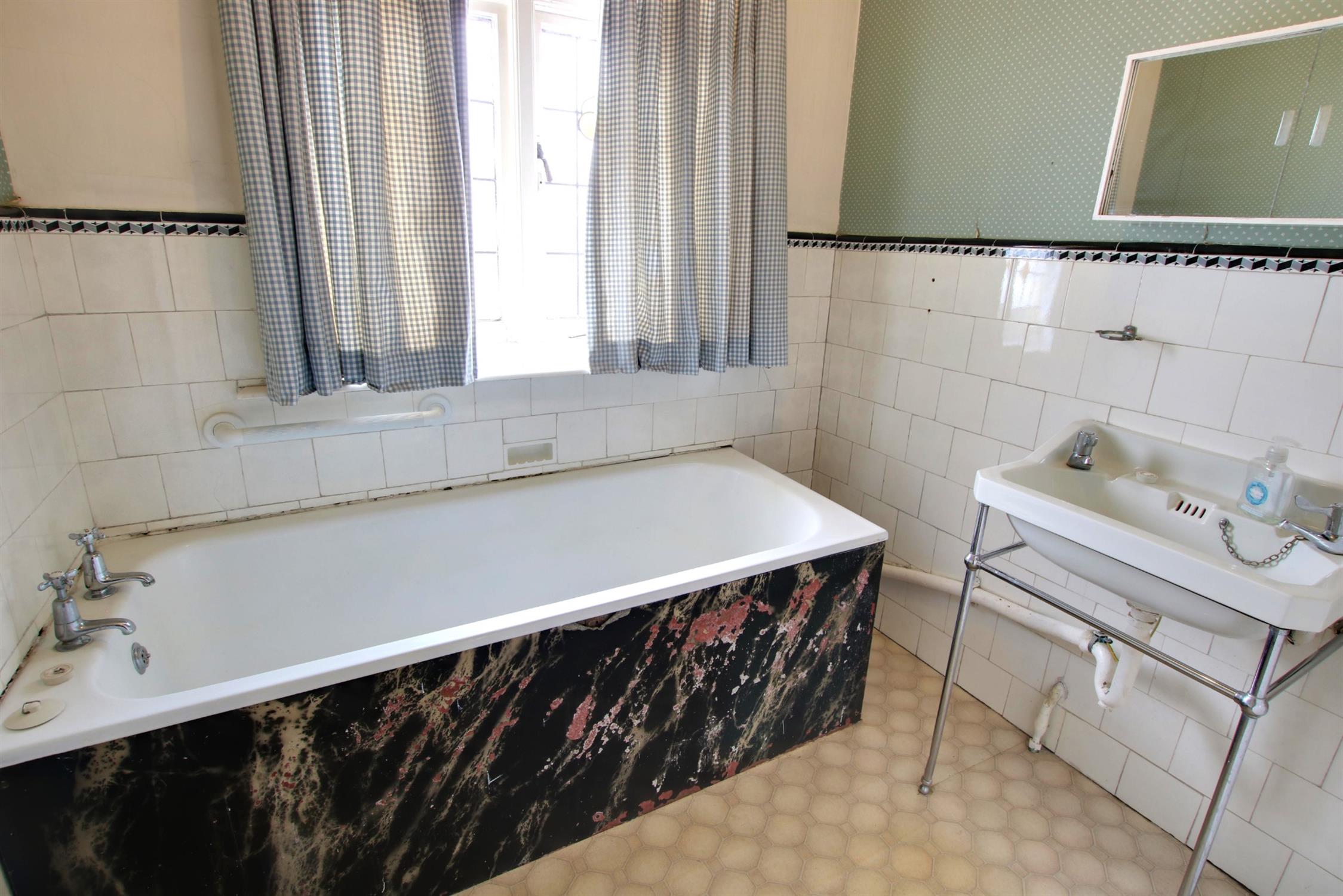 Panelled bath with separate shower over, Wash hand basin. Obscure glazed leaded finish with stained glass insert window. Partly tiled wall surfaces