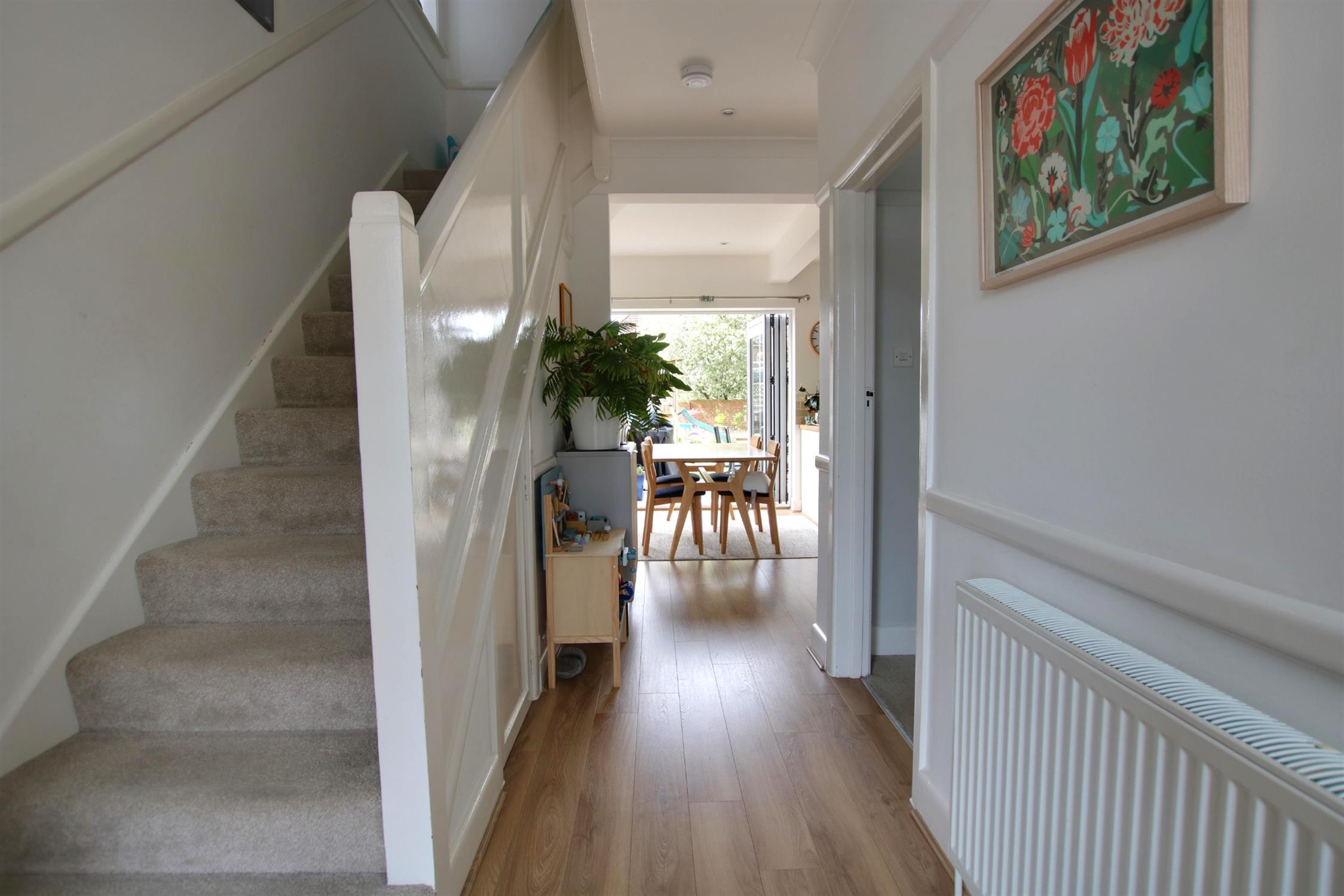 Skimmed ceiling with coving. Picture rail. Stairs to first floor, under stairs storage cupboard. Door to sitting room and opening to open plan kitchen/dining room.