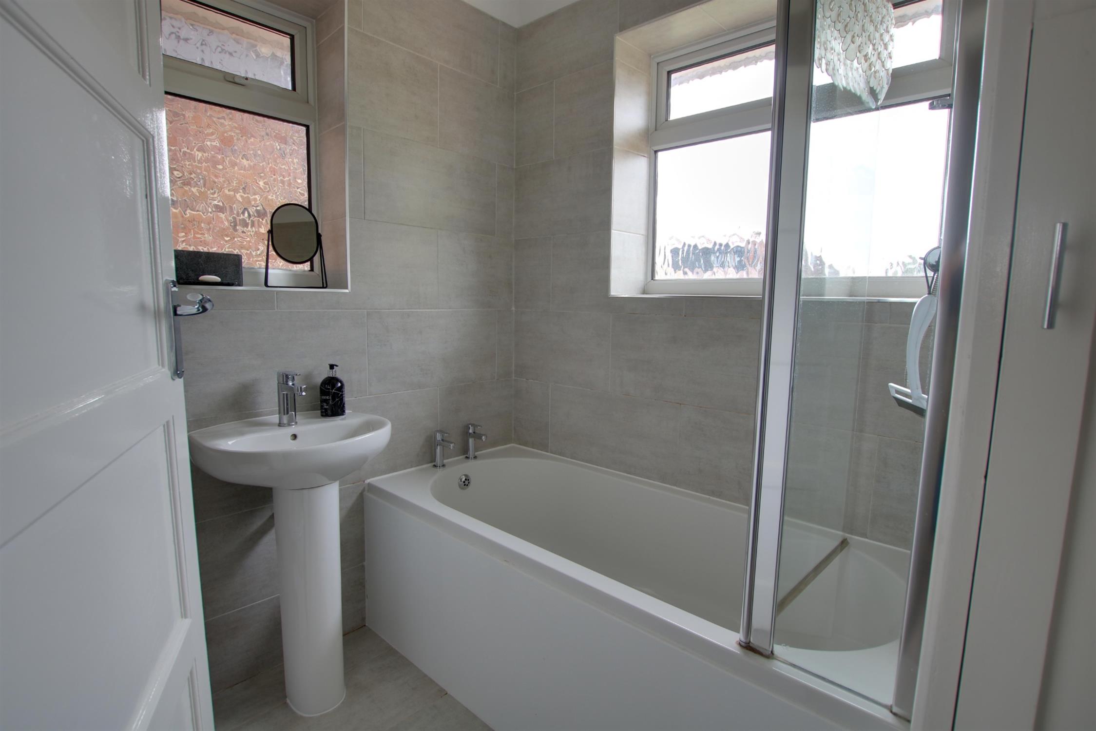 Skimmed ceiling with coving. Obscure double glazed windows to rear and side aspects. Chrome finish heated towel rail. Airing cupboard. A modern three piece suite comprising: low level flush wc, wash hand basin and panel enclosed bath with shower over. Fully tiled. Cupboard housing boiler.