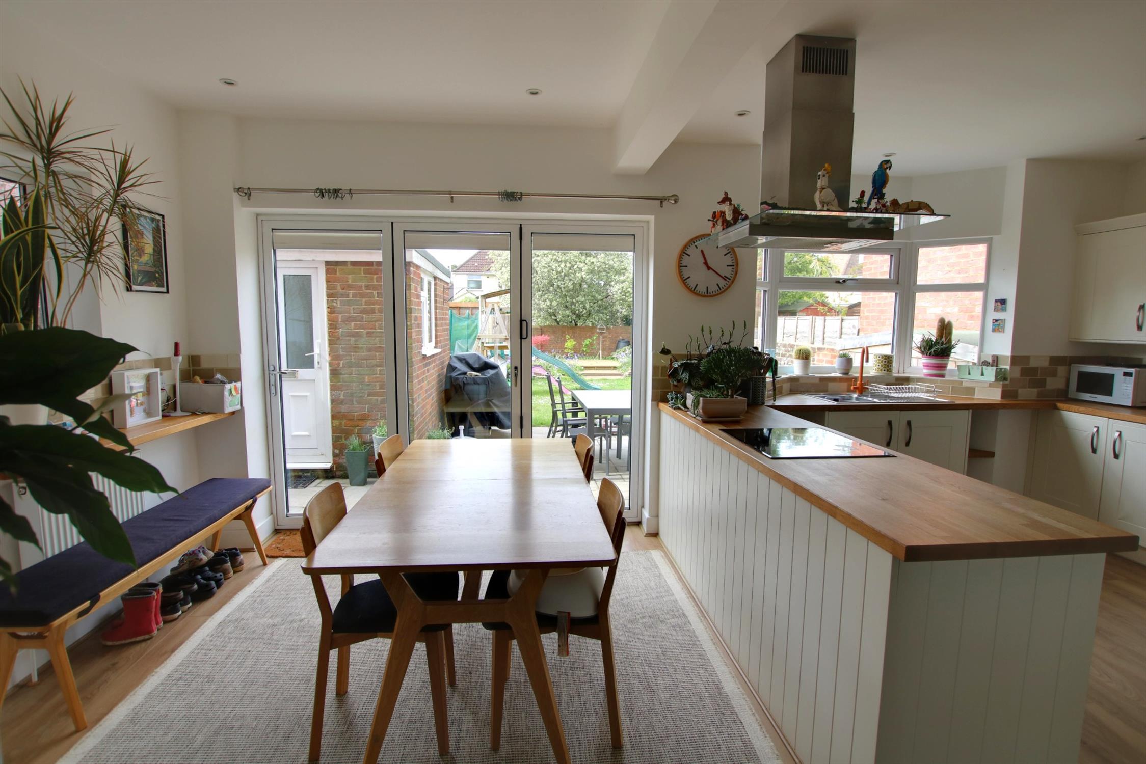 Skimmed ceiling with spotlights. Double glazed windows to rear and side aspects. Double glazed door to side aspect. Bi-fold doors to rear garden. A comprehensive range of wall mounted and base units with wooden work top over and tiled splash back. Stainless steel sink and drainer. Integrated double oven. Integrated electric hob with 'Neff' extractor over. Space, power and plumbing accordingly for further white goods.