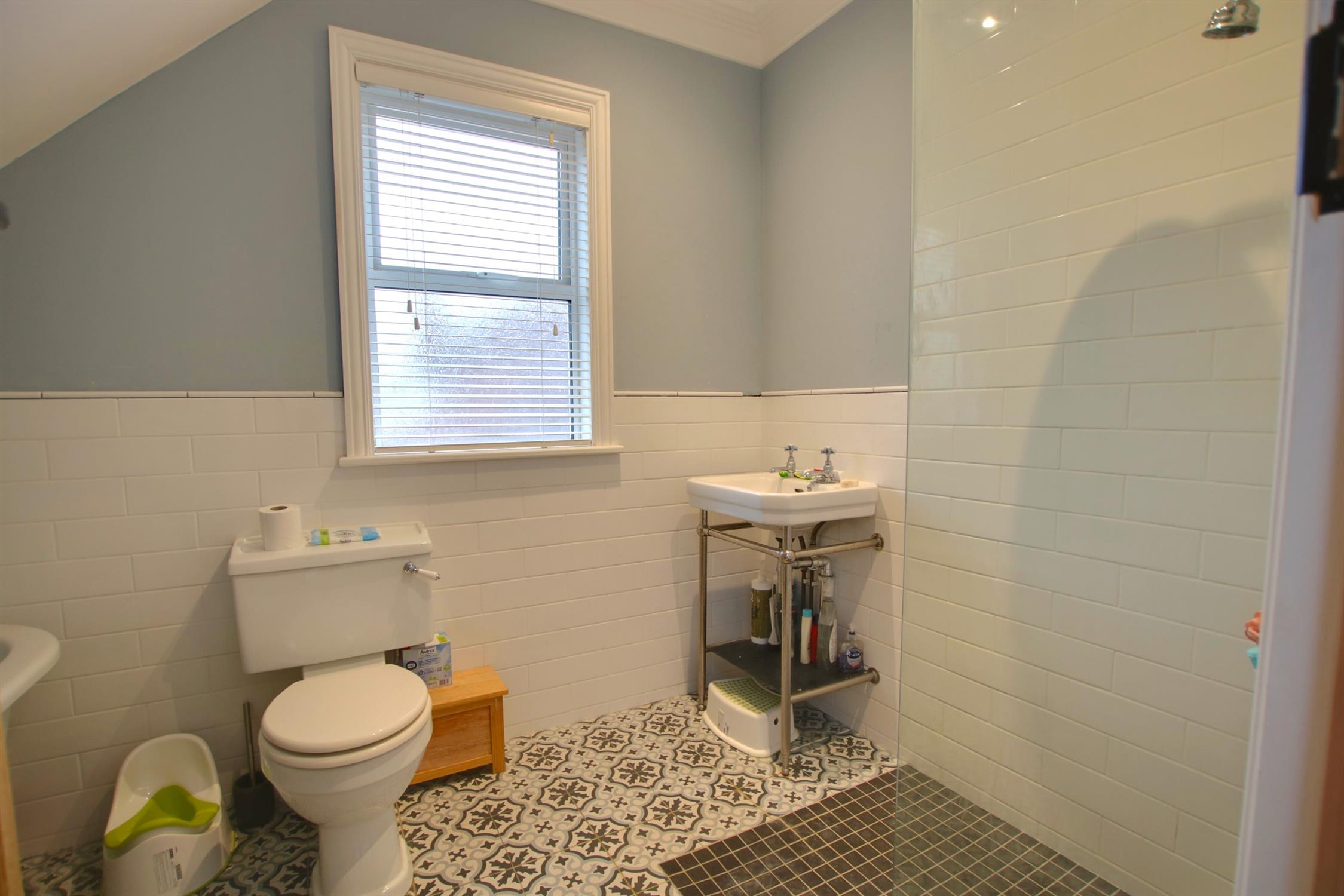 Double glazed obscure glass window to side aspect. Period plaster coving to smooth ceiling with recessed lighting. Vanity wash basin with mixer tap and cupboard under, low level flush w.c. and p-shaped bath with rainfall shower head and separate shower attachment. Radiator. Laminate flooring.