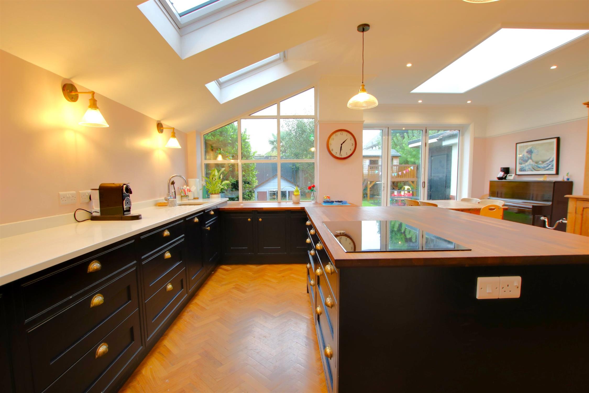 Double glazed velux windows and sky light. Double glazed window to rear aspect. Double glazed bi-fold doors opening onto rear garden. One and a half bowl sink unit with qettle instant boiler mixer tap. A range of matching kitchen units with soft close action and quartz worktop over. Island unit with inset induction hob. Built-in slide and hide oven with additional microwave combi oven and warming drawer. Integrated dishwasher. Integrated fridge/freezer. Parquet flooring. Door to:-