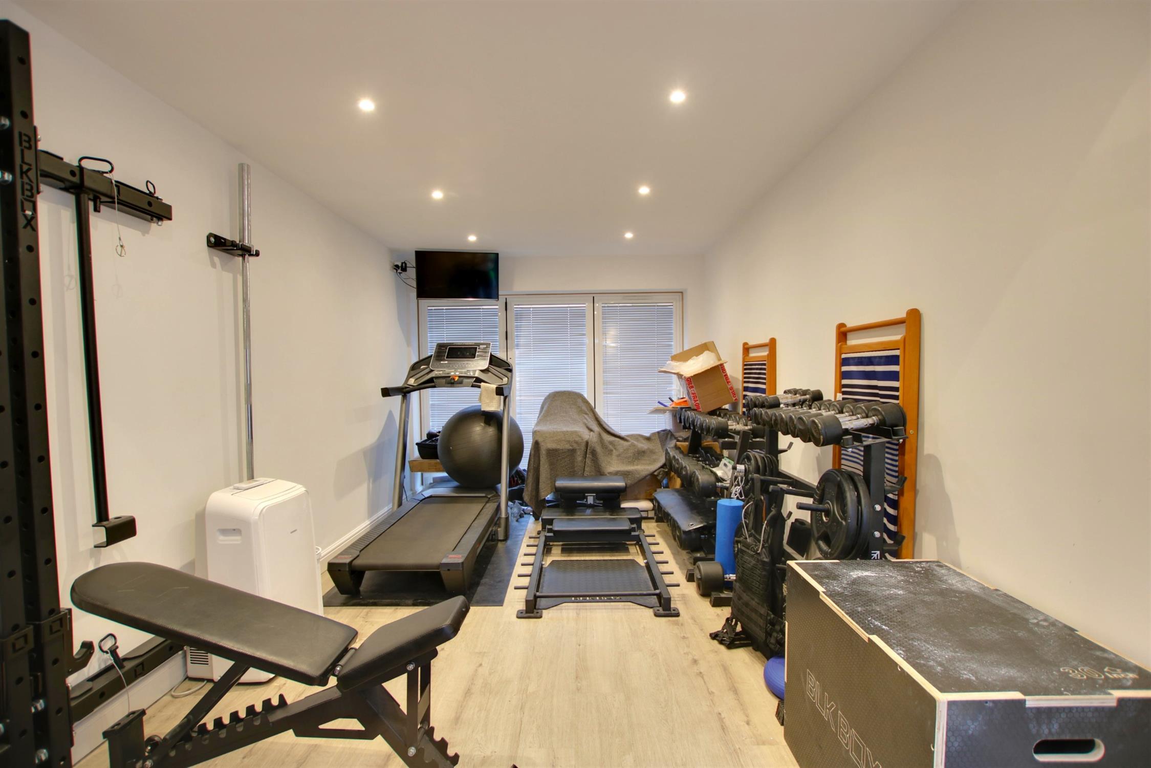 A fully insulated outbuilding with double glazed bi-fold doors to front aspect. Smooth ceiling with recessed lighting. Laminate flooring. Multiple power points. Additional storage overhead. Double glazed door opening onto rear garden. Could be used as a gym or home office.