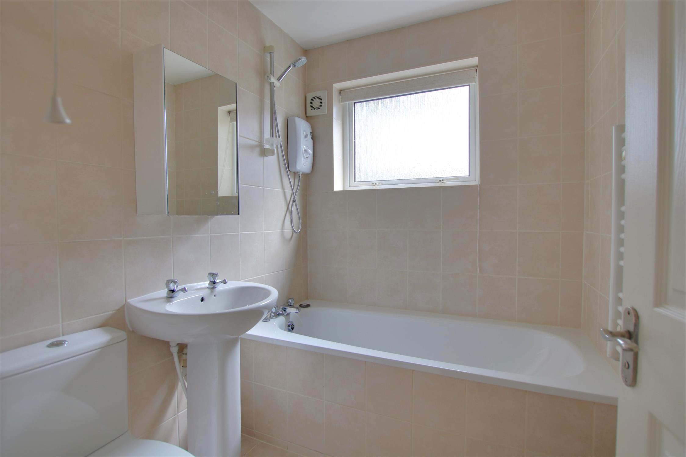 Tiled flooring and walls. Tile enclosed bath with electric shower. Low level W.C and wash basin. Extractor fan. Obscure double-glazed window to front aspect. Heated towel rail.