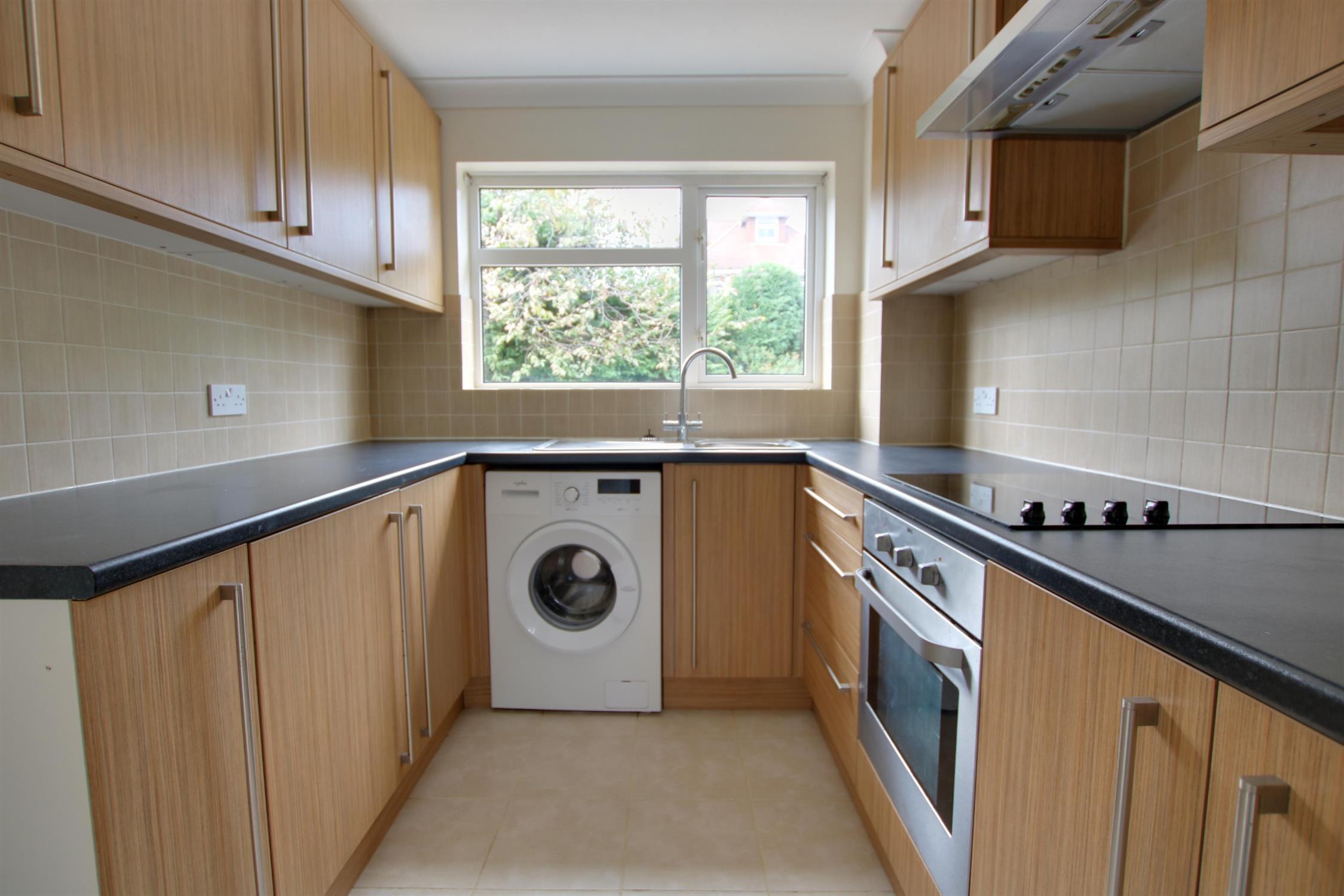 Tiled flooring. Matching wall and base units with tiled splashback. Inset stainless steel sink. Integrated electric oven and hob with extractor hood. Space for fridge-freezer and washing machine. Double-glazed window to rear aspect.