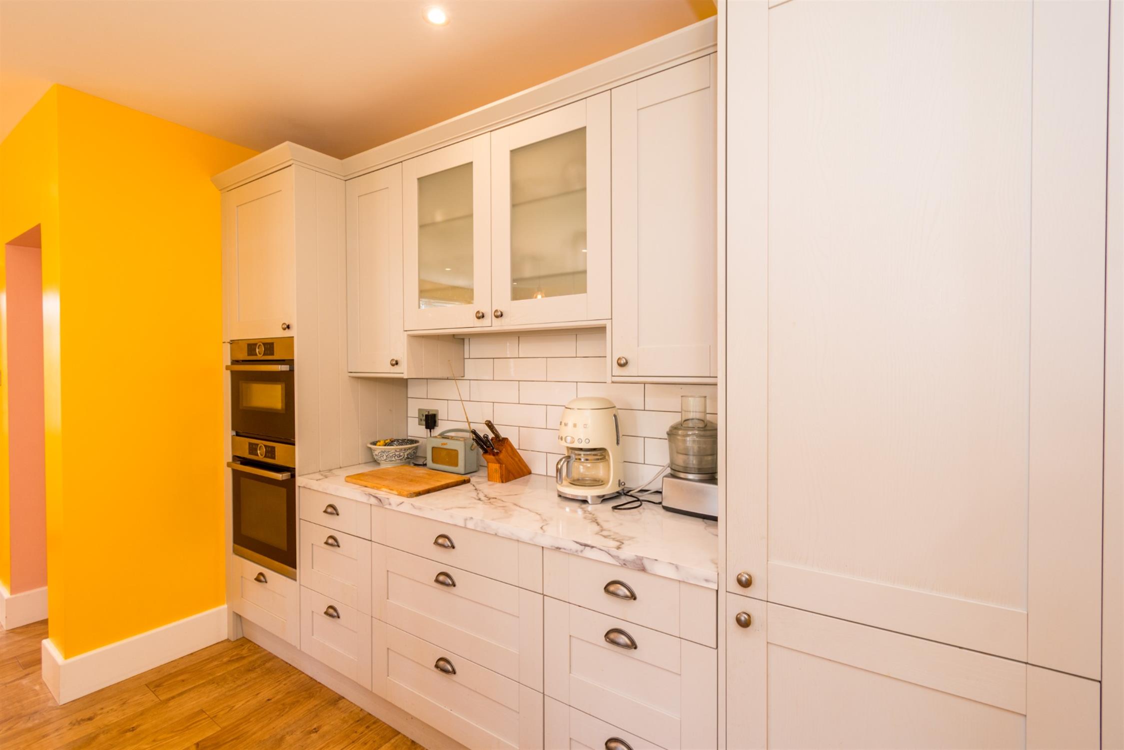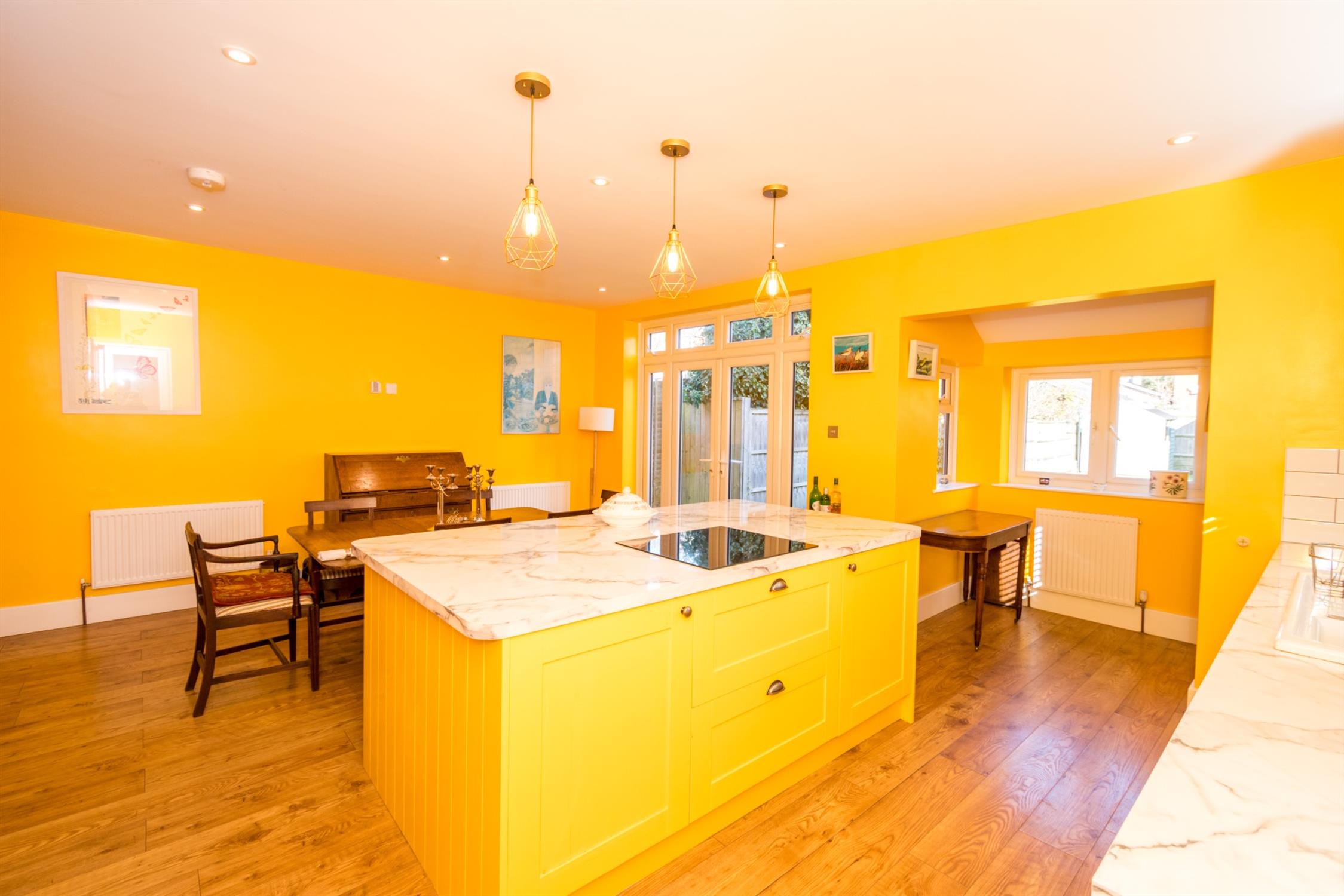 Double glazed windows to side aspect. Double glazed French doors opening onto rear garden. Smooth ceiling with recessed lighting. Single drainer one and a half bowl sink unit with mixer tap and cupboard under. A range of matching eye level and base mounted units with roll top work surface over. Island unit with inset four ring induction hob. Built-in double oven. Integrated dishwasher and fridge/freezer. Cupboard housing wall mounted combination boiler. Four radiators. Opening to:-