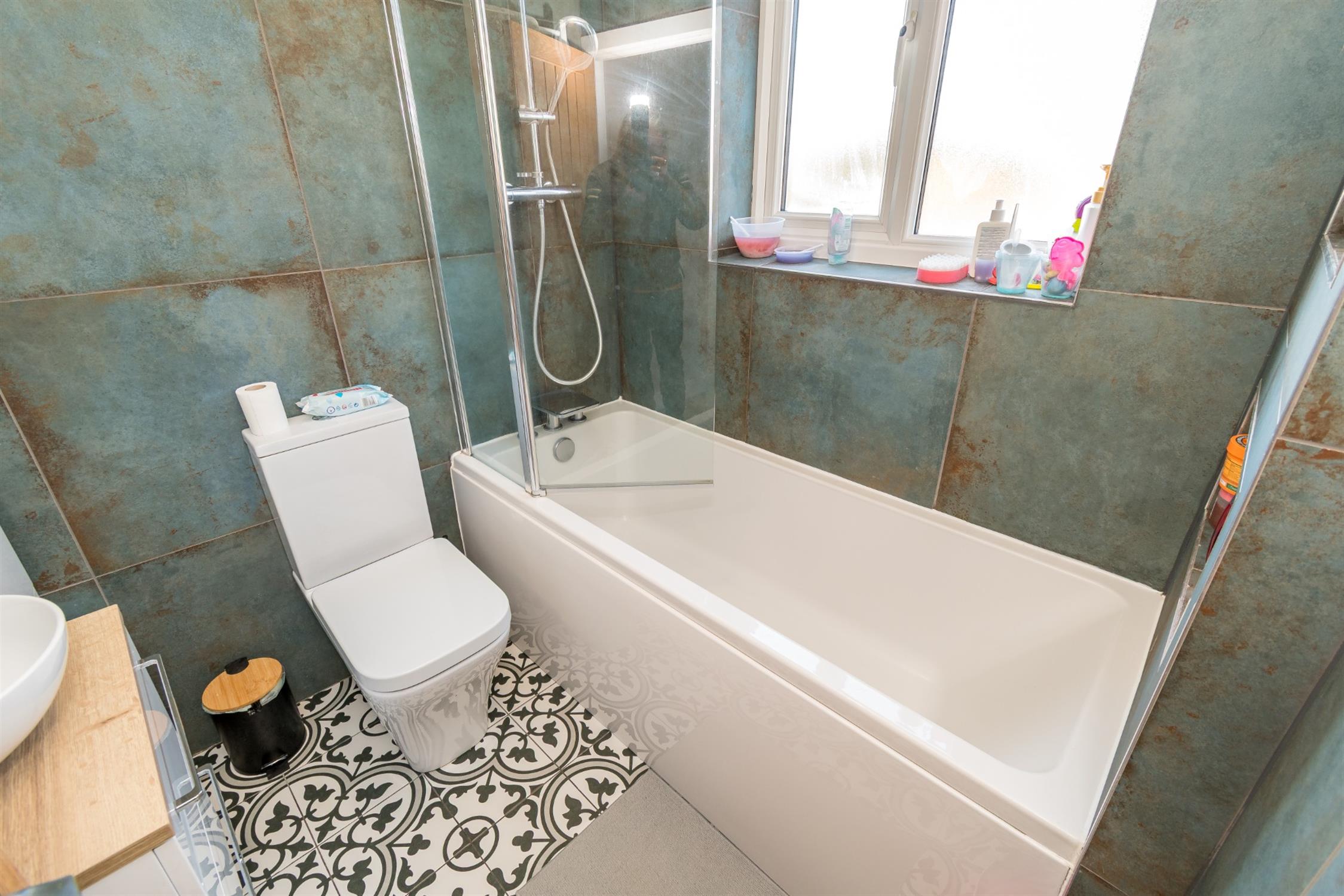 Double glazed obscure glass window to side aspect. Smooth ceiling. Panel enclosed bath with mixer tap, shower attachment and rainfall shower head over, vanity wash basin with mixer tap and drawers under and low level flush w.c. Heated towel rail. Tiled walls and flooring.