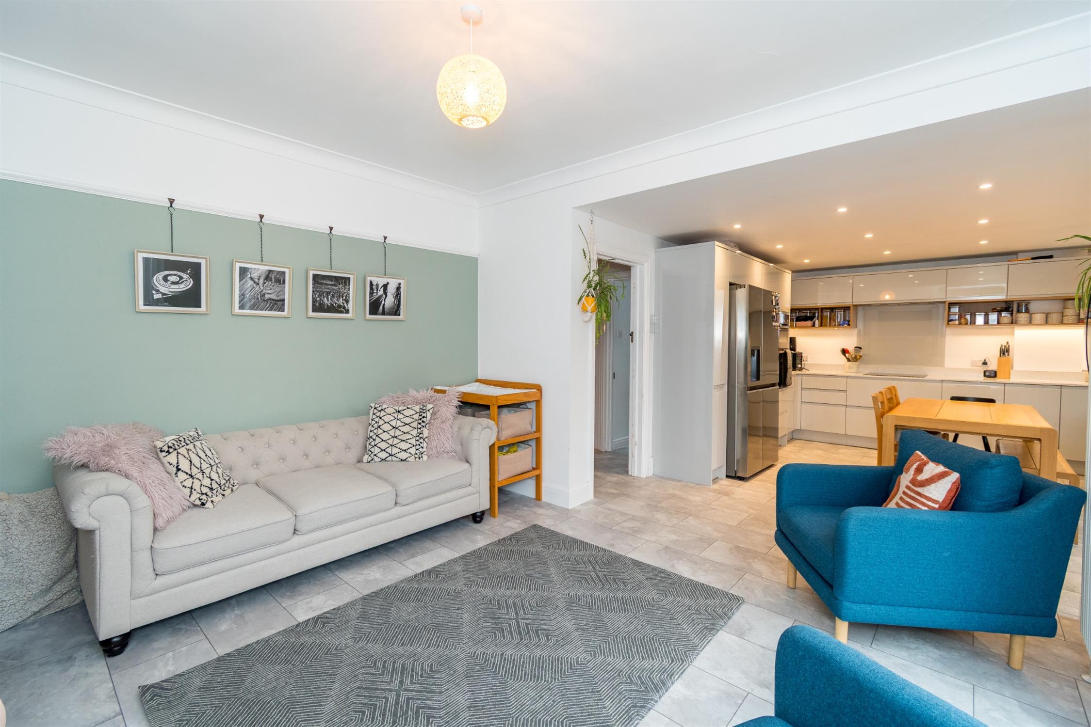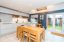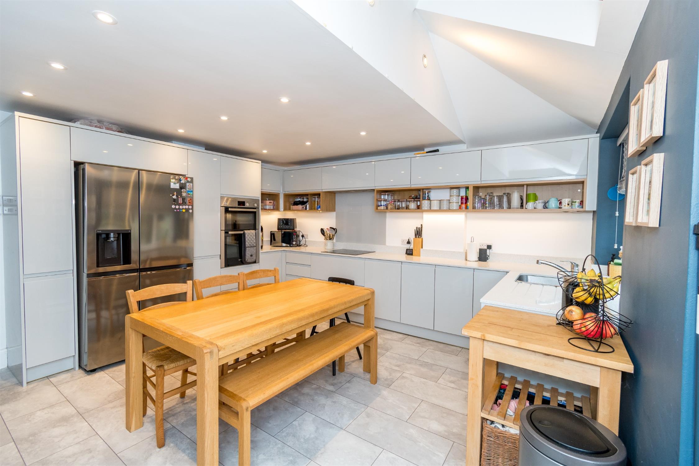 Double glazed velux window to rear aspect. Double glazed window to rear aspect. Double glazed French doors opening onto rear garden. One and a half bowl sink unit with mixer tap and cupboard under. A range of matching eye level and base mounted high gloss units with quartz worktop over and soft close action. Space and plumbing for dishwasher. Space for American style fridge/freezer. Fitted four ring induction hob with extractor over. Built-in double oven.