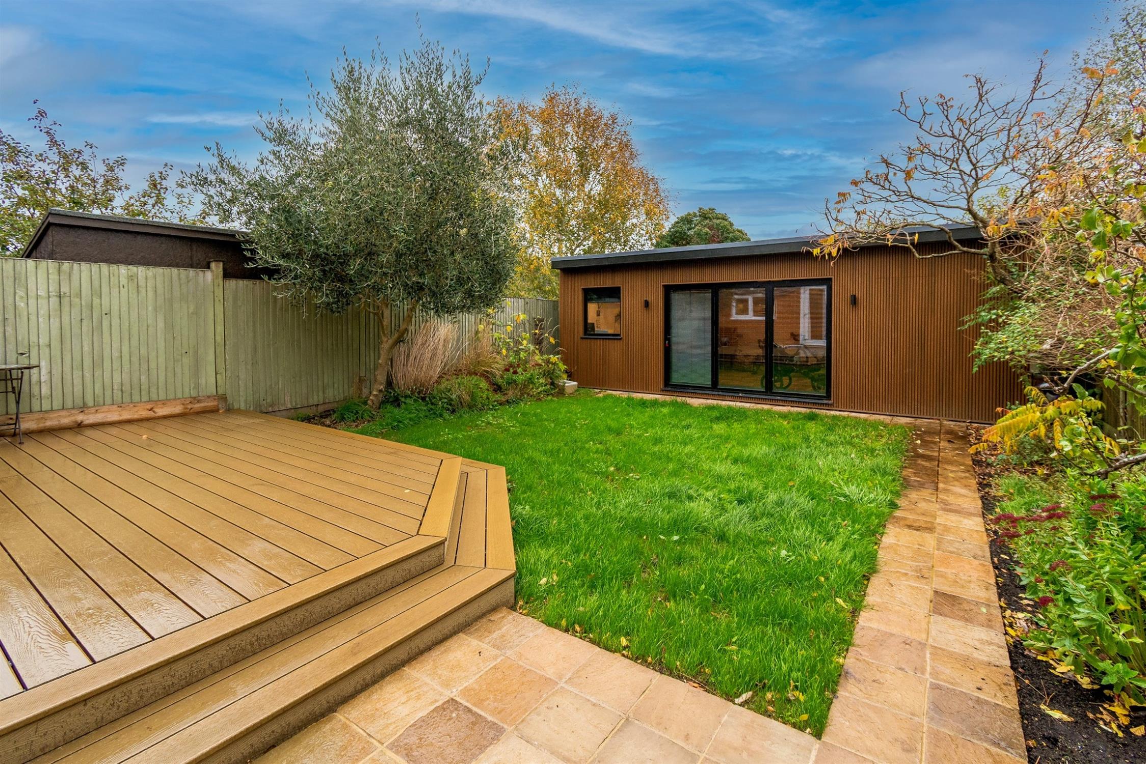 The rear garden has the benefit of a south easterly aspect and is fully enclosed with decked patio seating area, raised flower beds, external power point and outside tap. The remainder of the garden is laid to lawn with mature flower and shrub borders. There is a detached outbuilding which is fully insulated and is divided into three sections with a home office, gym and garden store.