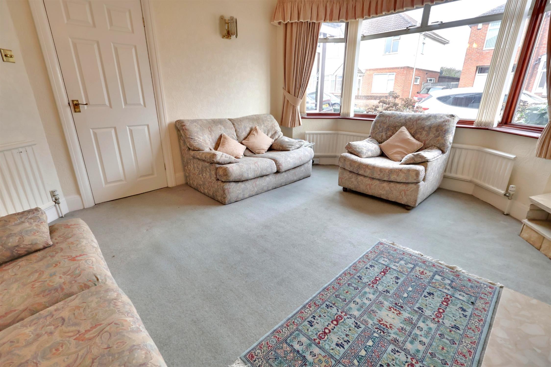 Double glazed aluminium bay window. Carpeted flooring. Wallpapered walls and textured ceilings. Fireplace. Radiators