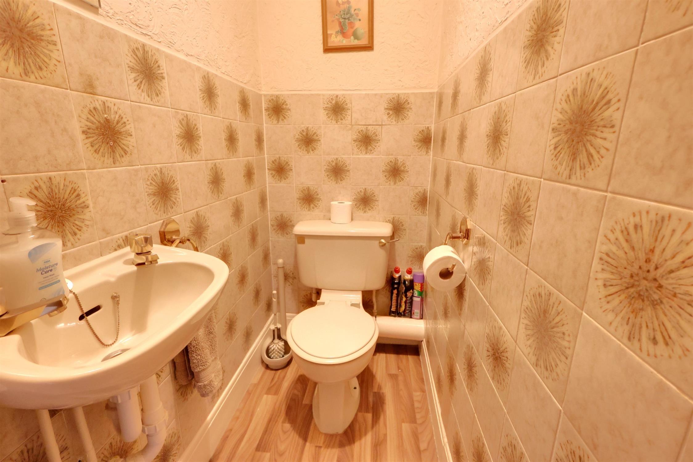 Part tiled walls, textured ceiling. Wall mounted wash basin and low level flush w.c. Lino flooring.