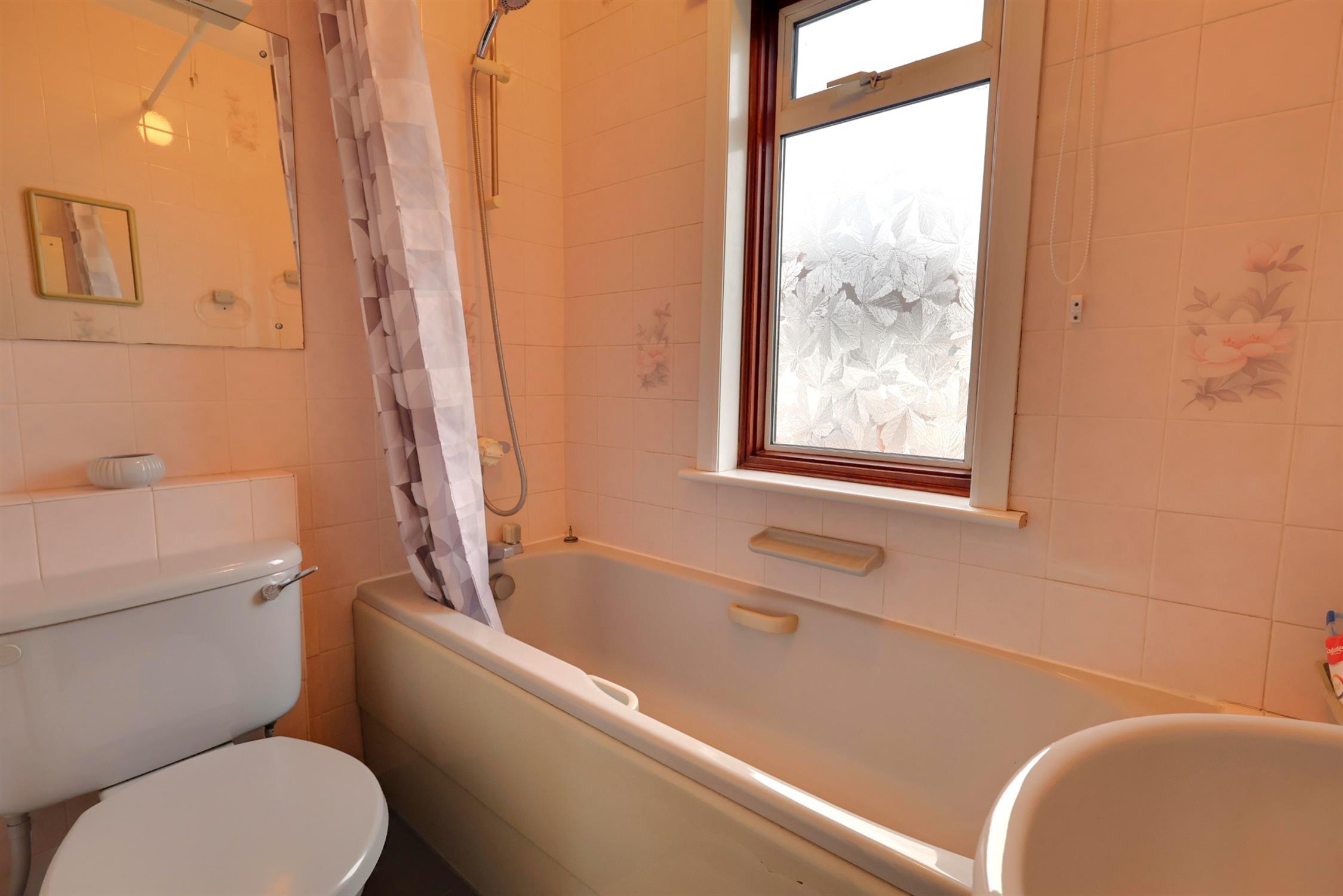 Double glazed obscure glass windows to front aspect. Low level w.c. Panelled bath with shower above and central mixer tap. Tilled walls and flooring.