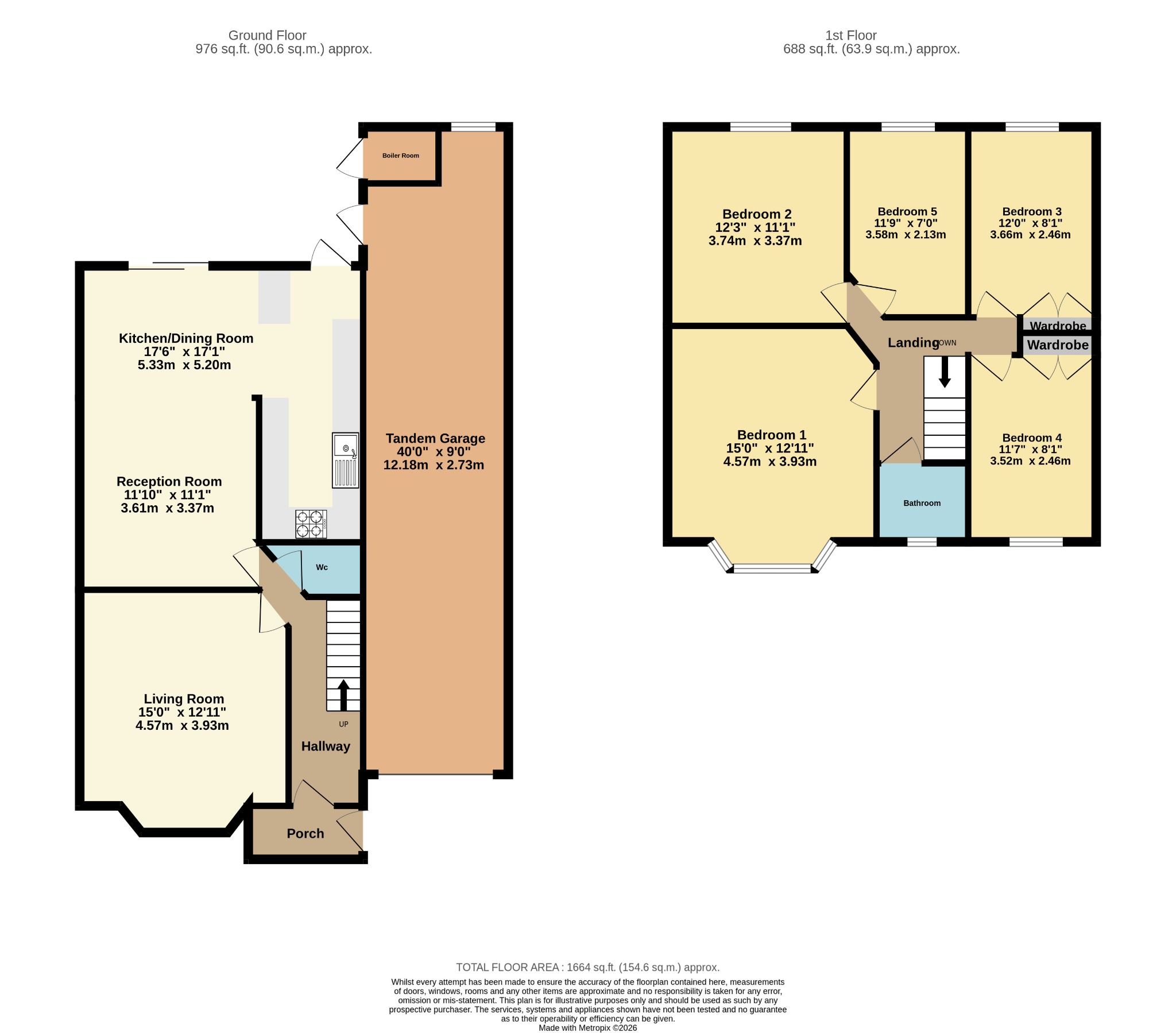 Integral tandem garage measuring approximately 40ft in length. Plumbing for washing machine and dryer, power and up and over door. Boiler room with Wocestor bosch boiler included.