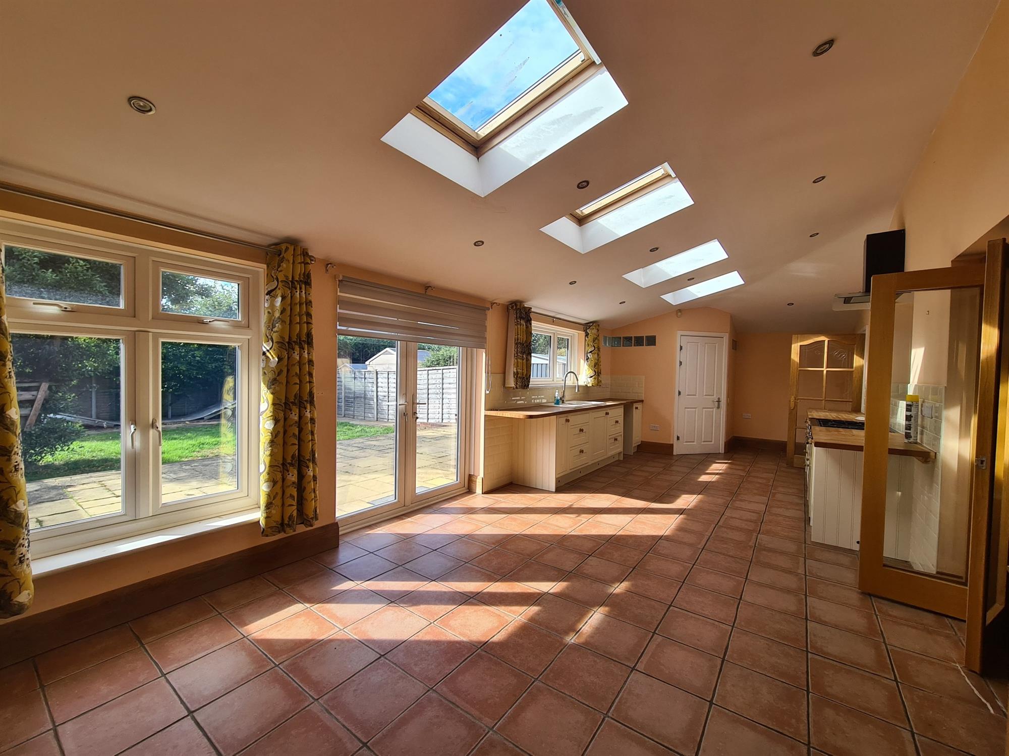 KITCHEN - Large kitchen dining room with double gas oven, patio doors leading to the garden and four sky light windows.