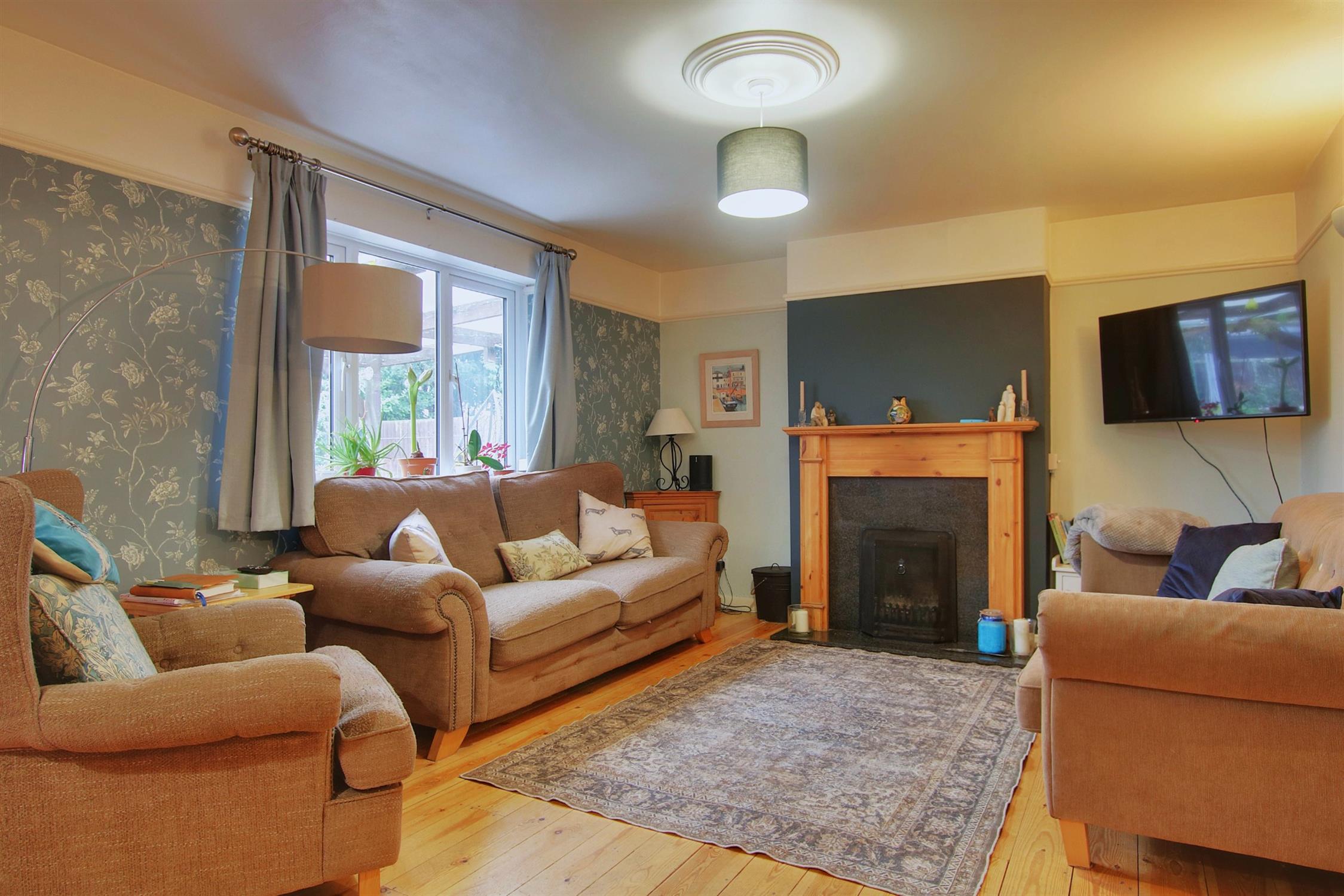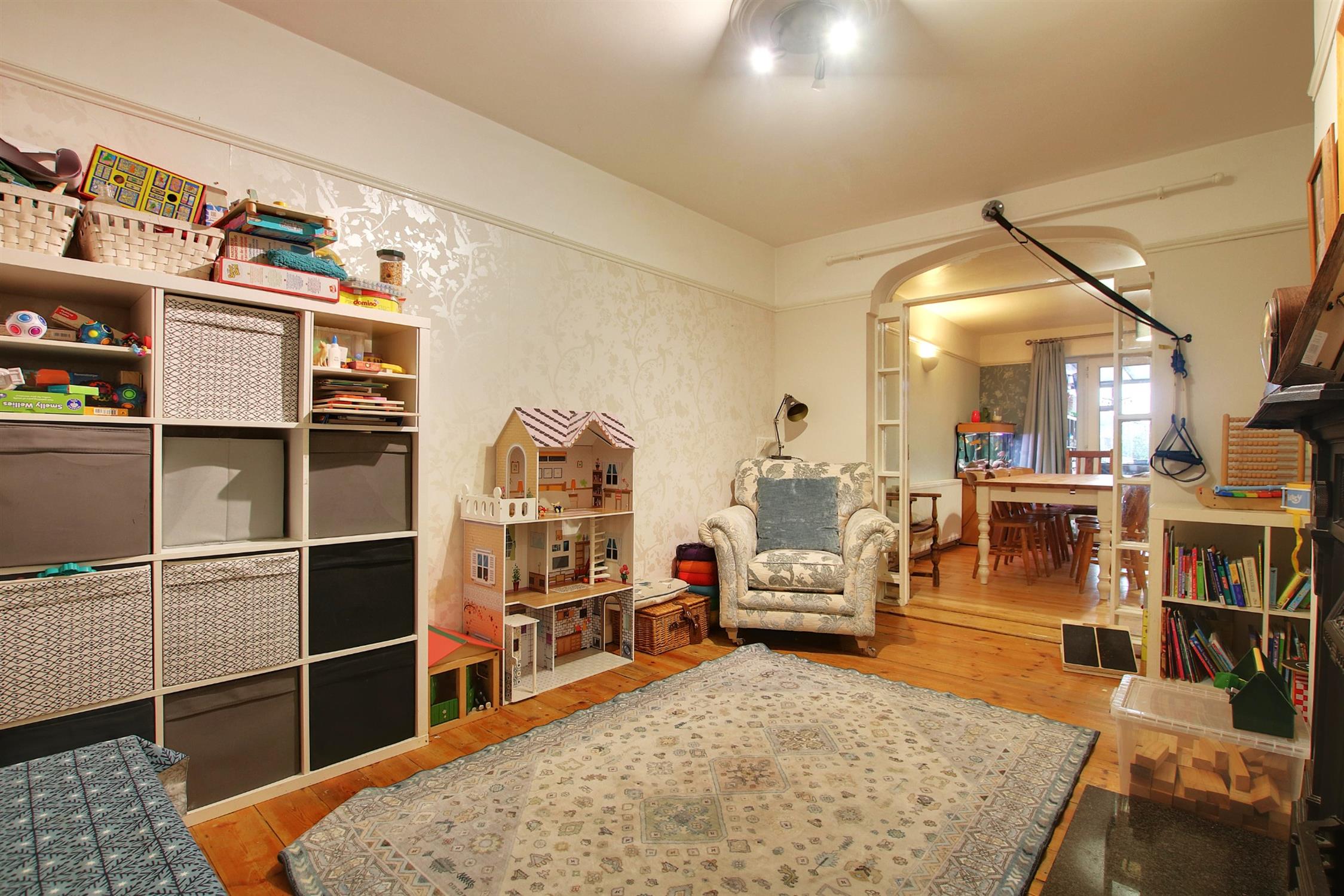 The original sitting room with open fireplace and stripped floor now serves as a family/play room, with double doors opening into the large sitting/dining room also with open fireplace and stripped floor. There are double doors connecting with the garden/boot room, itself with double doors to the garden, and an archway into the kitchen/breakfast room which has an extensive range of modern wall and base units, breakfast bar, ample appliance space, and a small but very useful adjoining utility room.